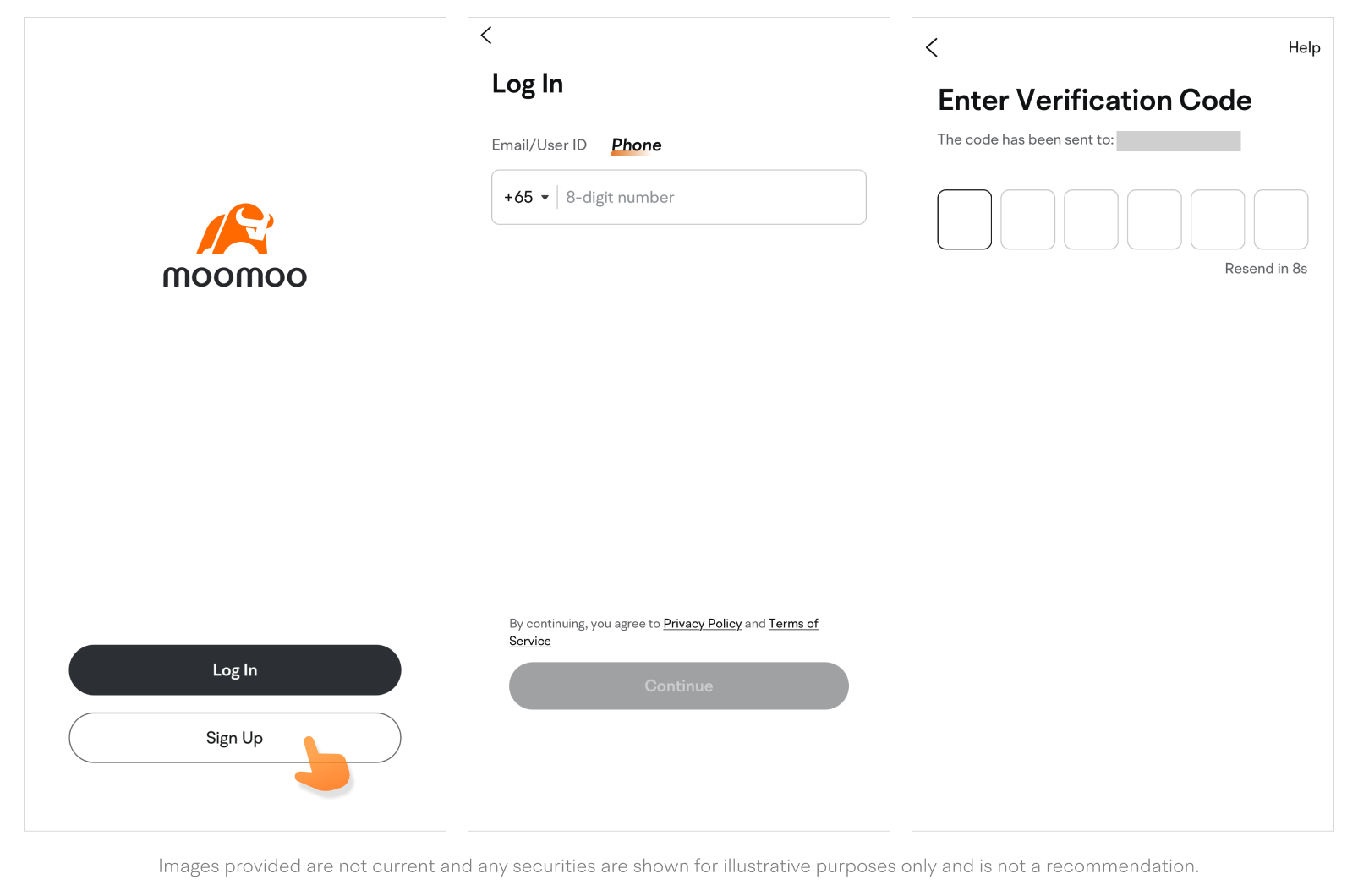 • Open the moomoo app, then tap Sign Up.
