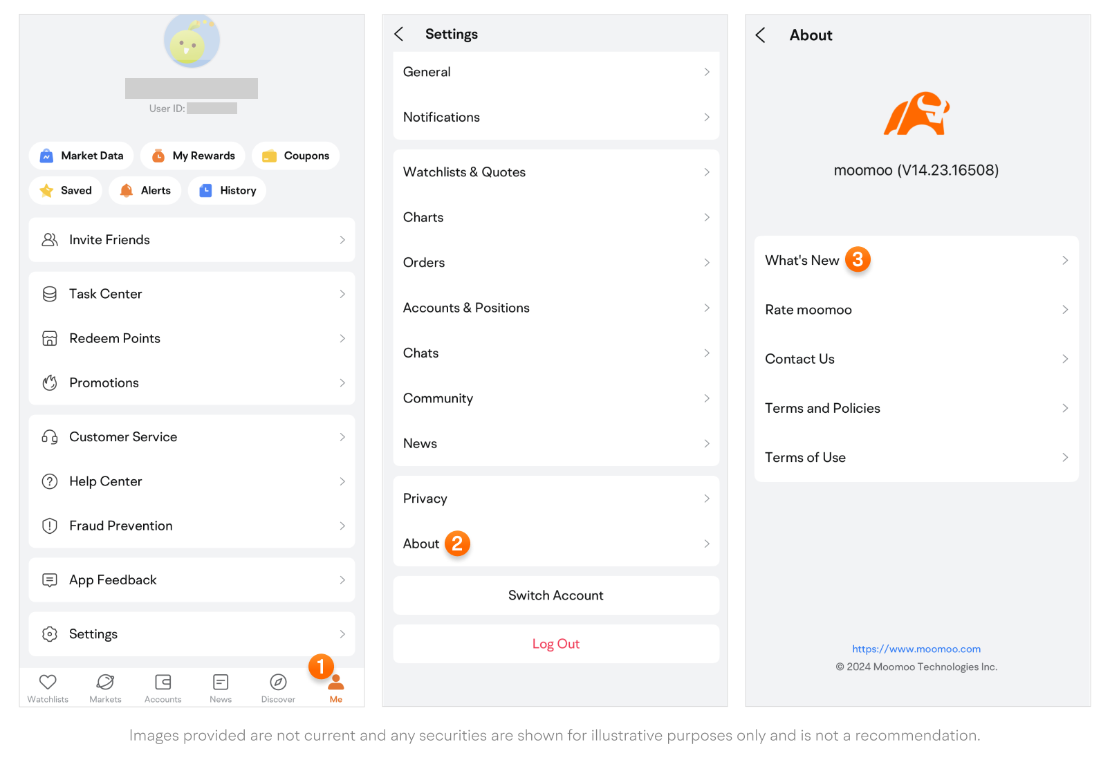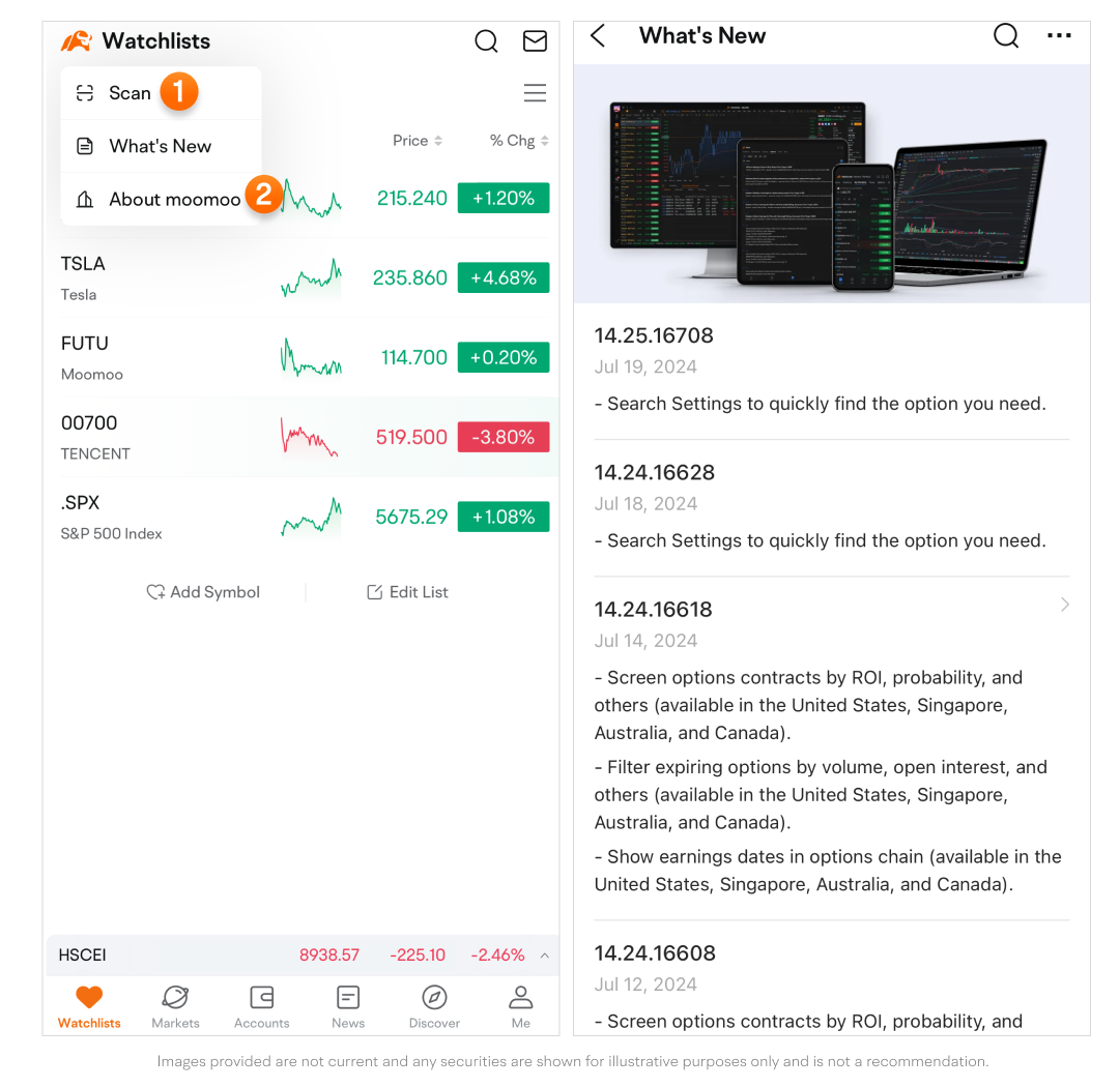 Tap the moomoo icon at the top left, then tap What's New to view the updates log and current app version.