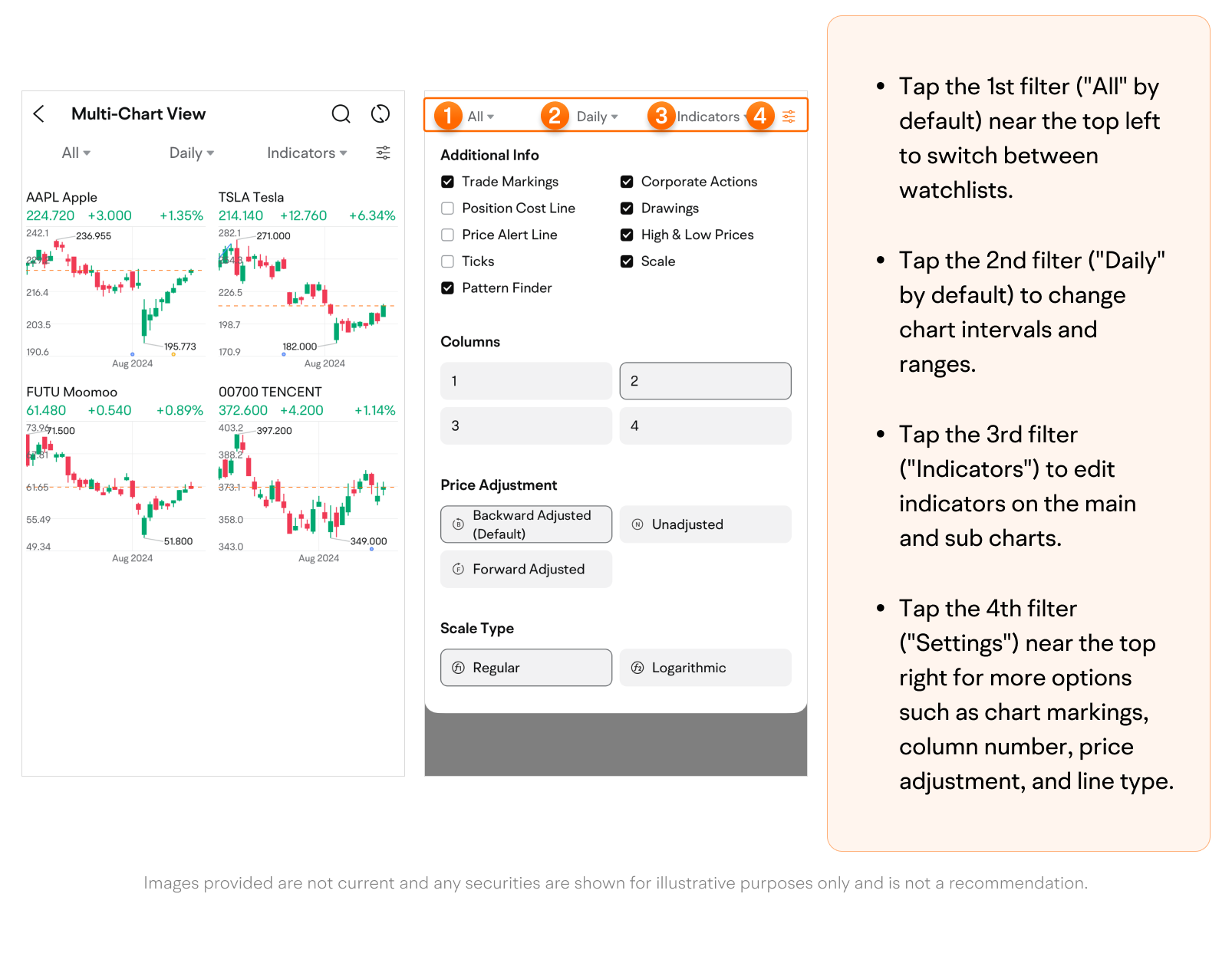 • Tap the 4th filter ("Settings") near the top right for more options such as chart markings, column number, price adjustment, and line type.