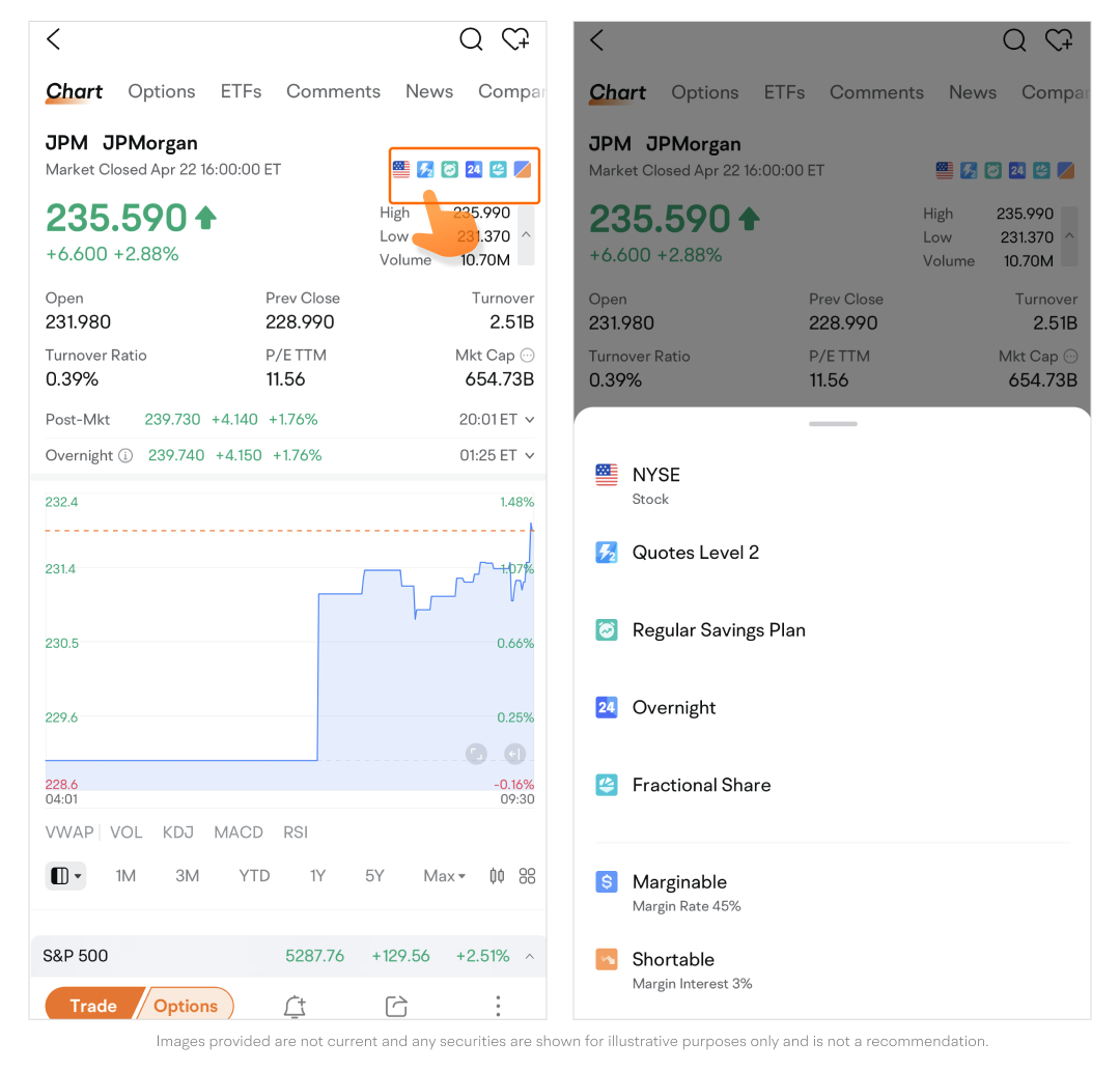 Icons provide essential information about a symbol, such as its listing exchange, type (stock, option, or other), and eligibility for overnight trading, regular savings plans, and margin trading.