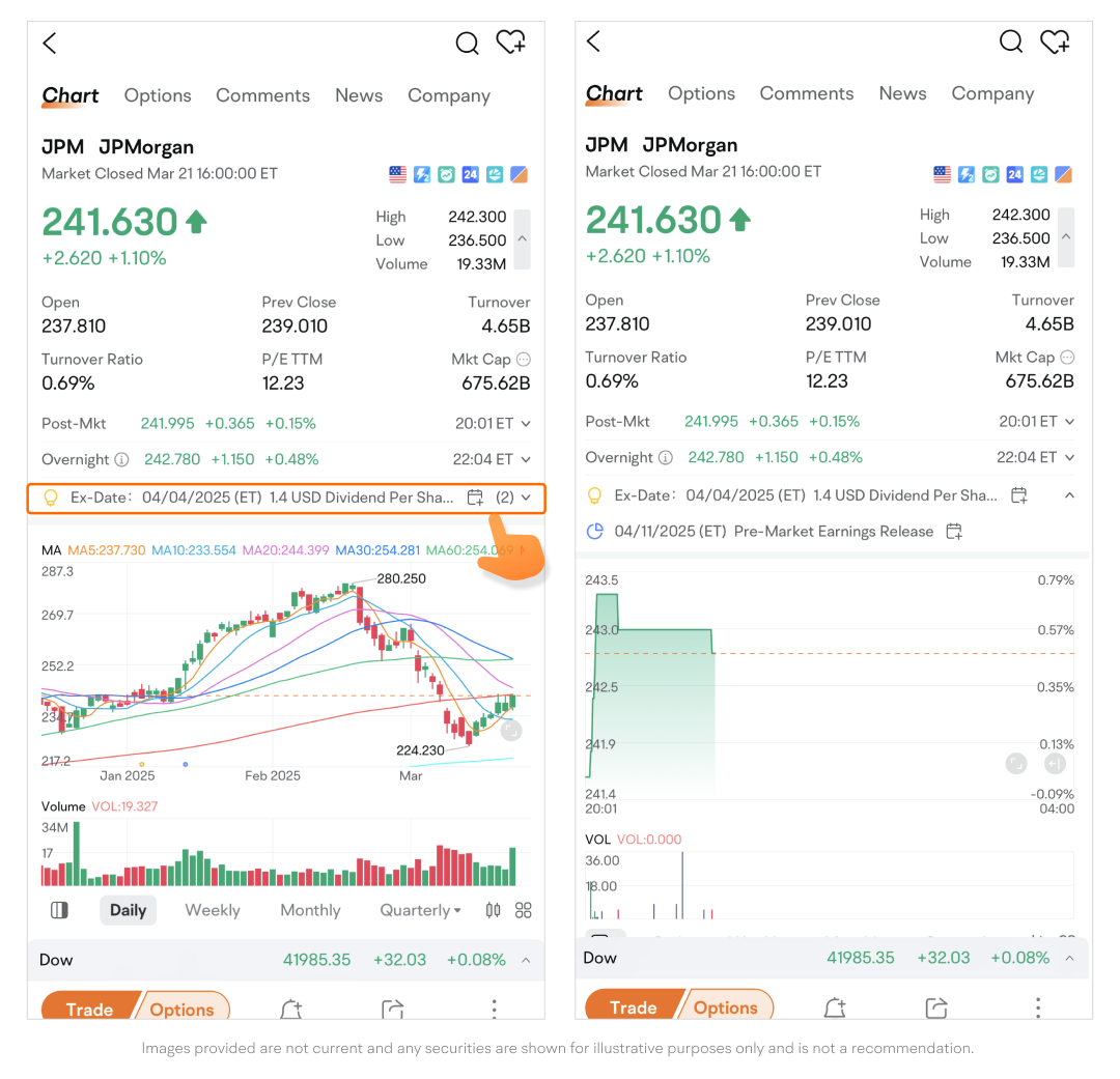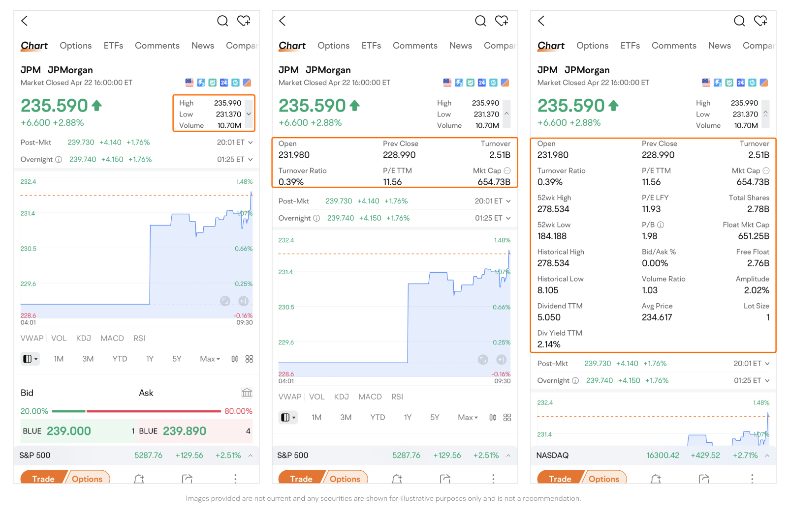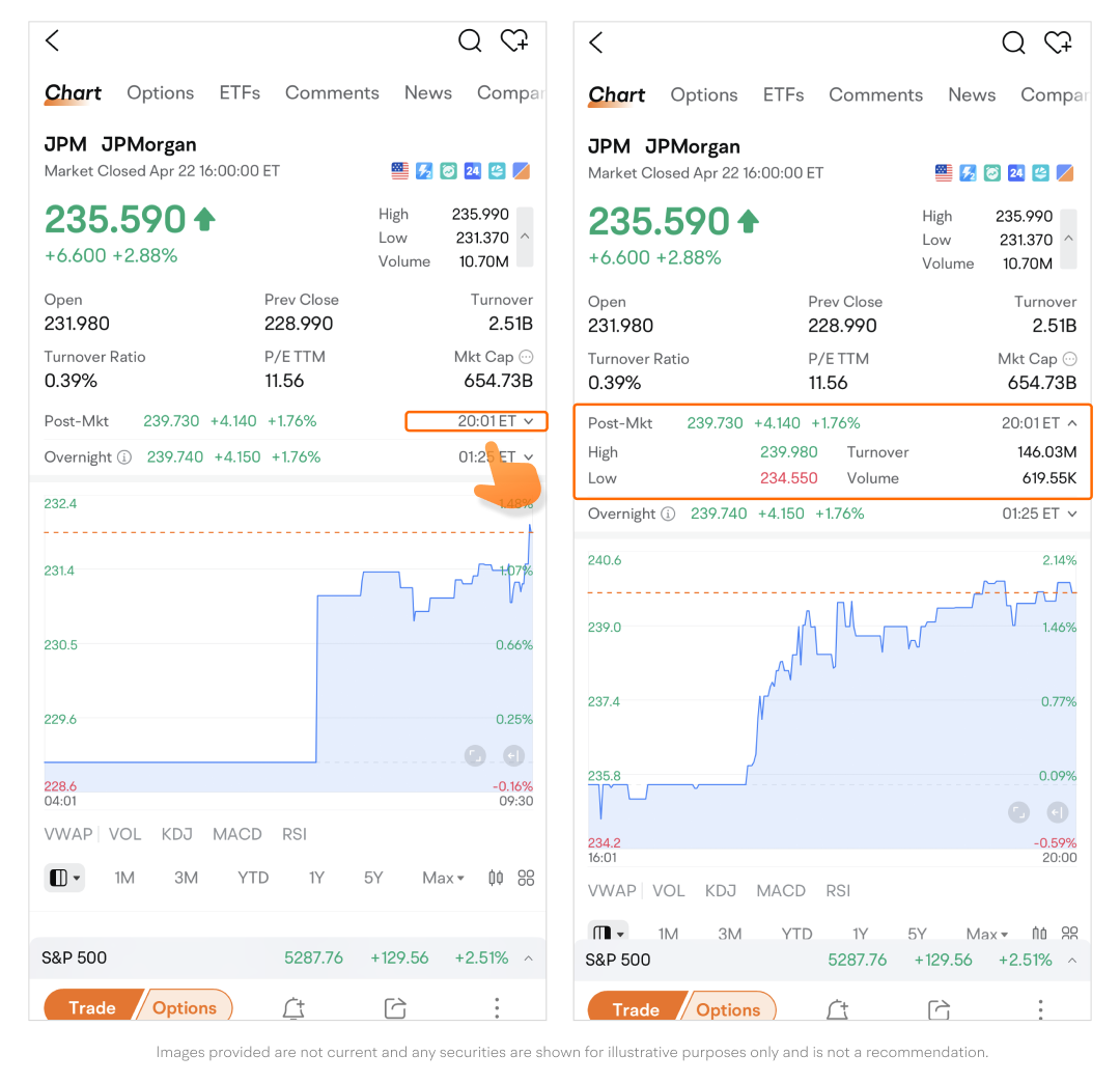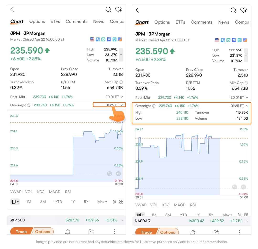 A quotes bar is displayed for US stocks during pre-market and post-marketing trading. For eligible stocks, overnight quotes are also available.