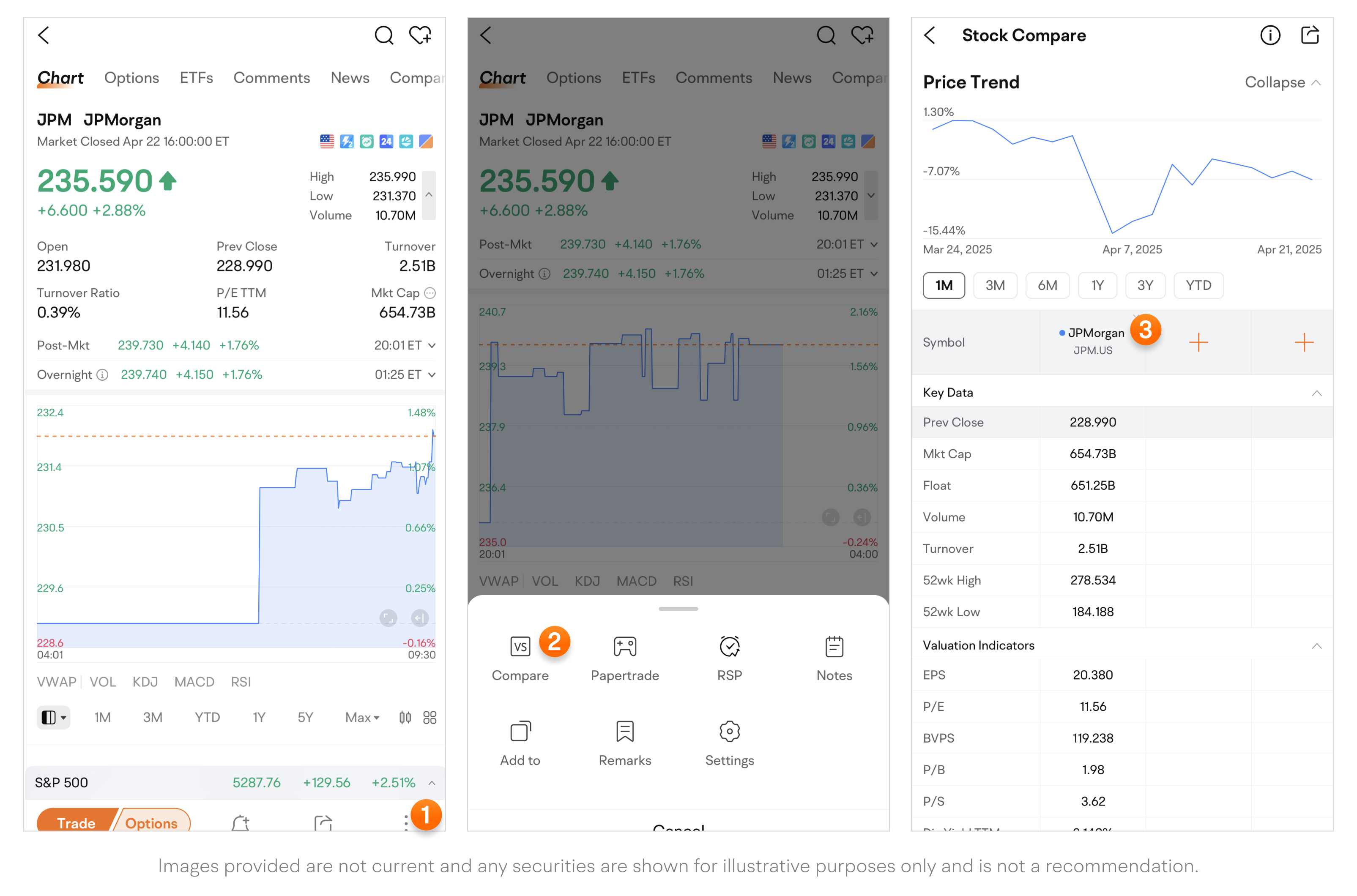 Path: Quotes page > Tap theicon at the bottom > Compare > Tap + to add symbols.