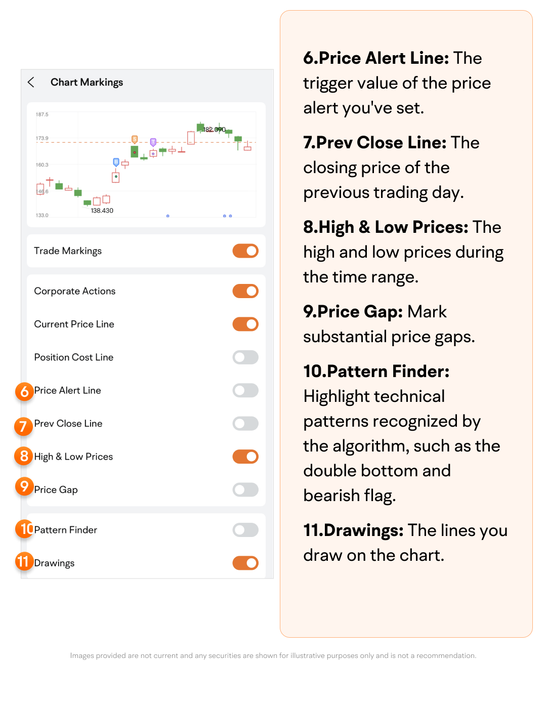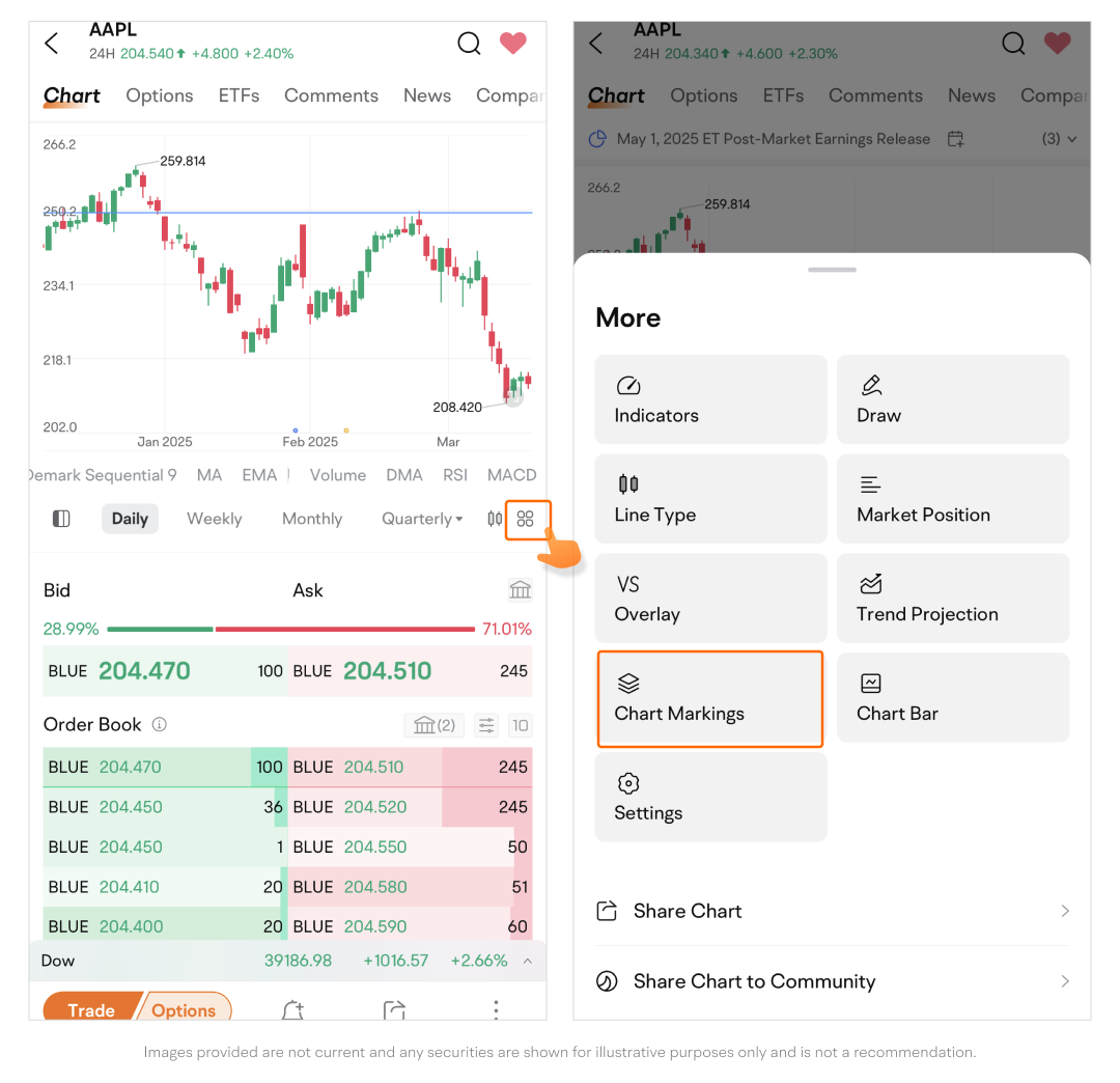 Path: Quotes page > Tap the "More" icon on the chart bar > Chart Markings.
