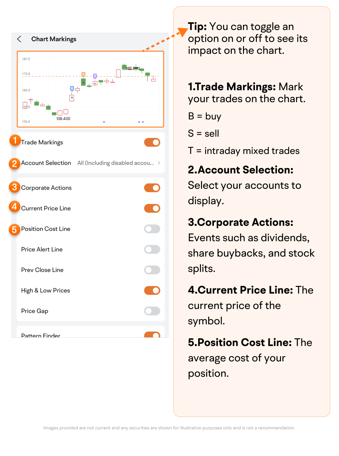 You can customize the markings displayed on the chart, such as trade markings, corporate actions, the position cost line, and more.