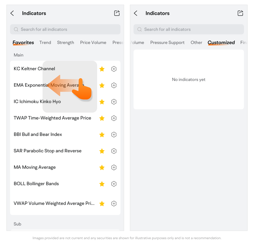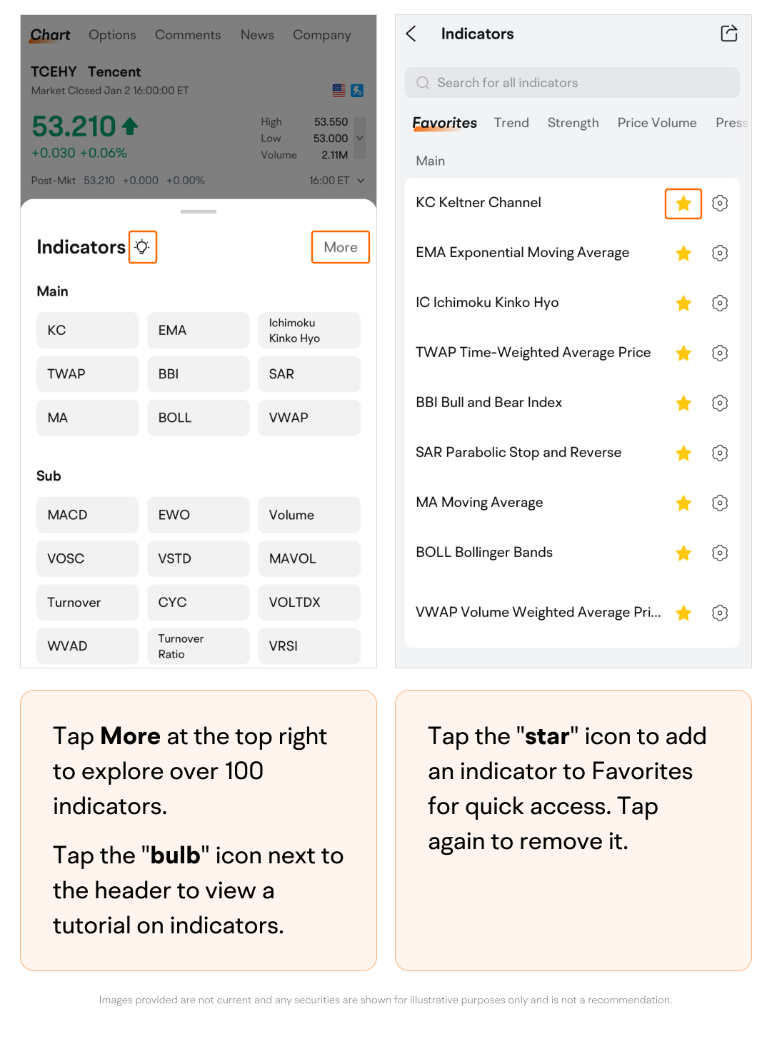 Path: Quotes page > Tap the "more" icon from the chart bar > Indicators.