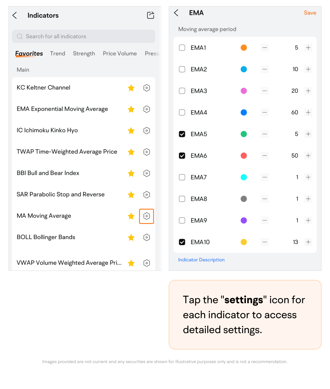 • Tap the "settings" icon for each indicator to access detailed settings.