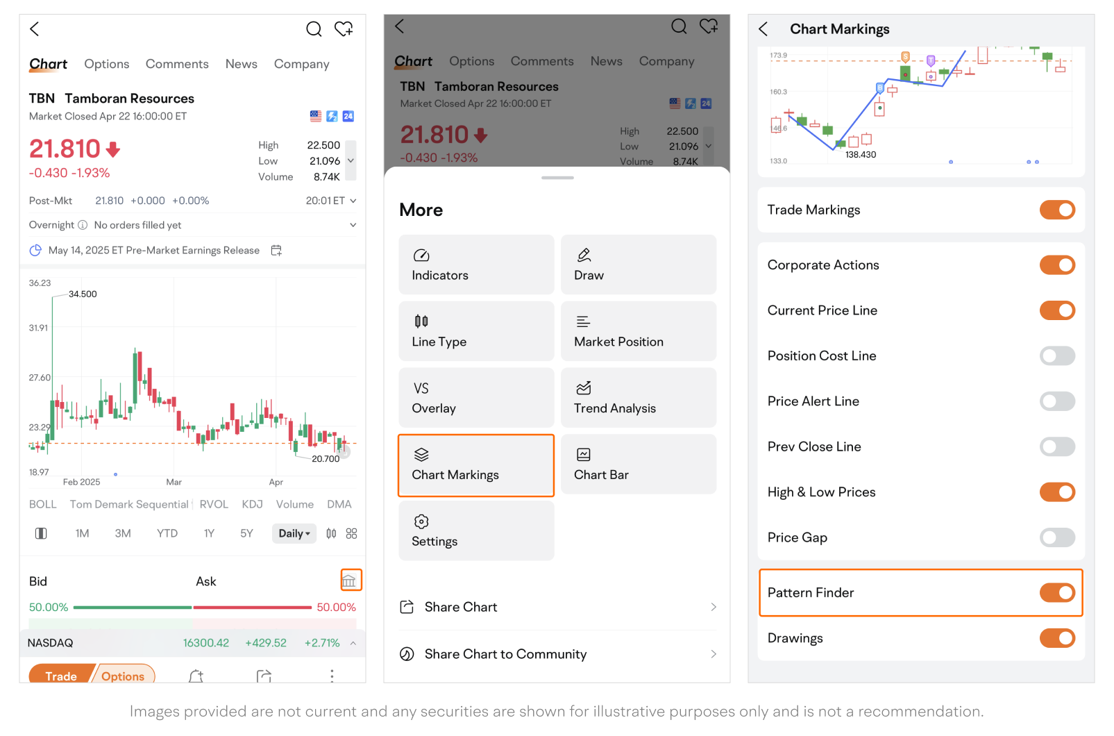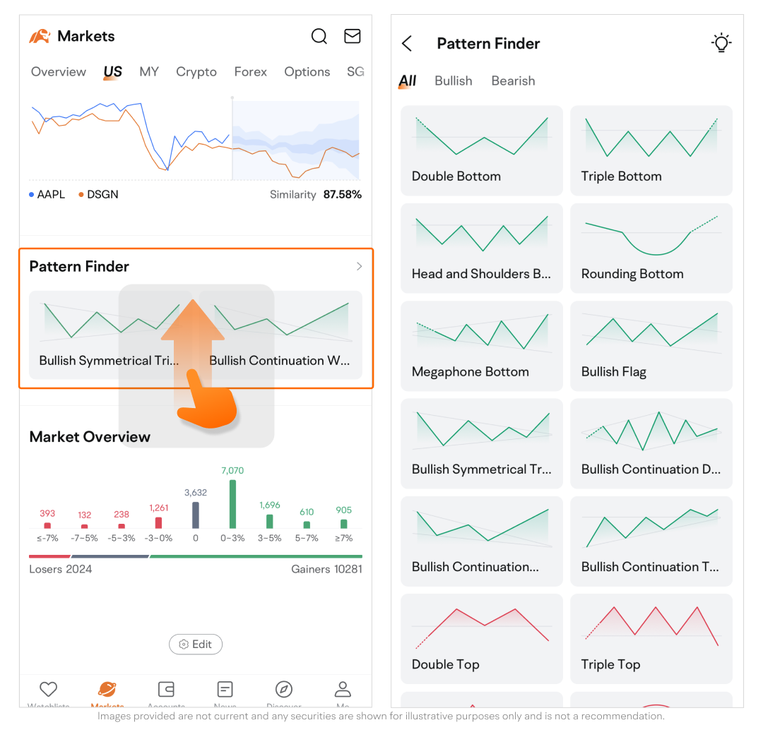 Path 2: Markets > US > Swipe up to find Pattern Finder.