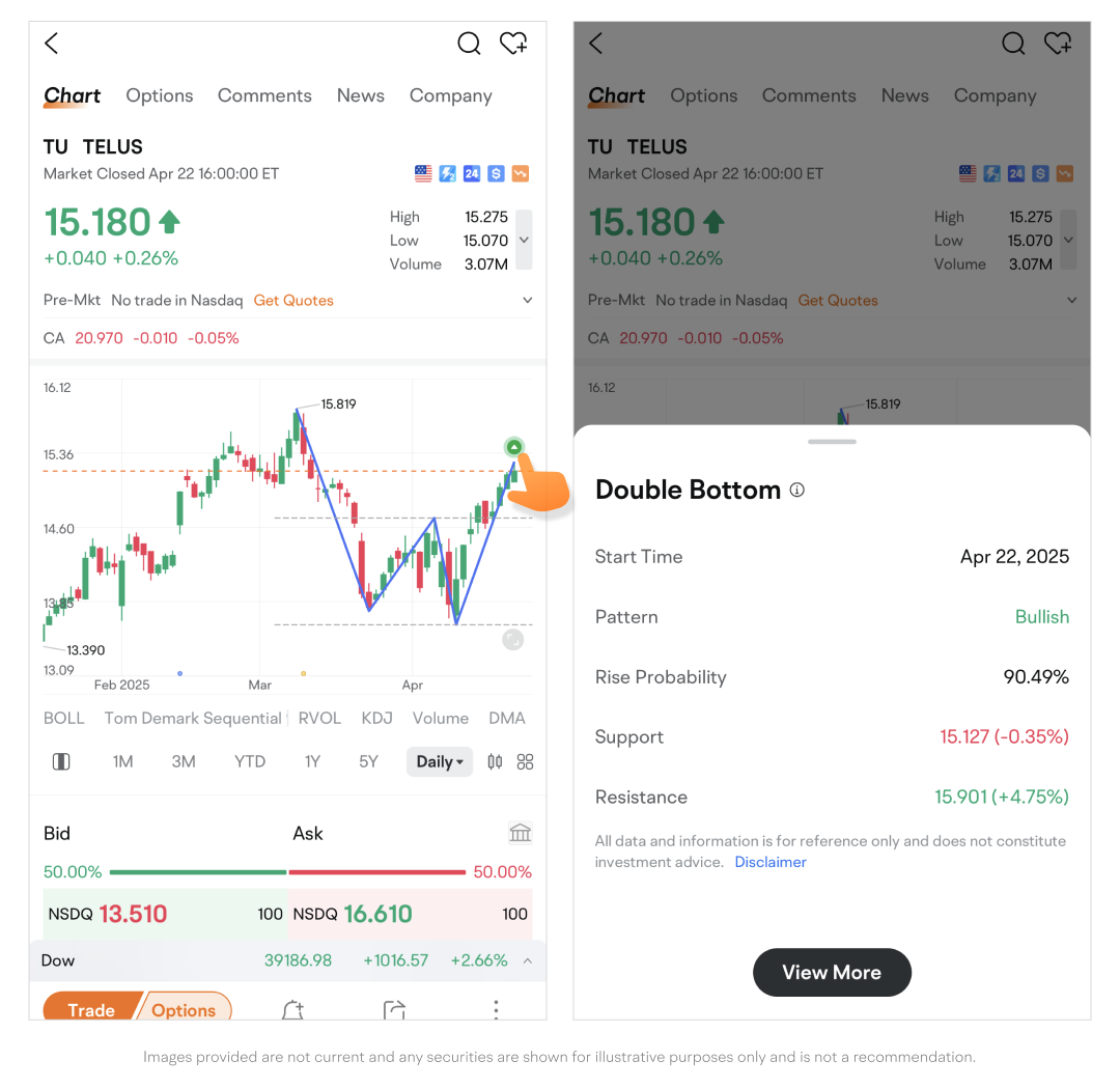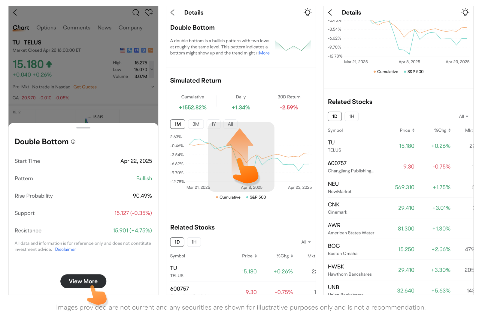 Tap View More to access the pattern page and view the pattern introduction, simulated returns, and a list of stocks that exhibit the same pattern.
