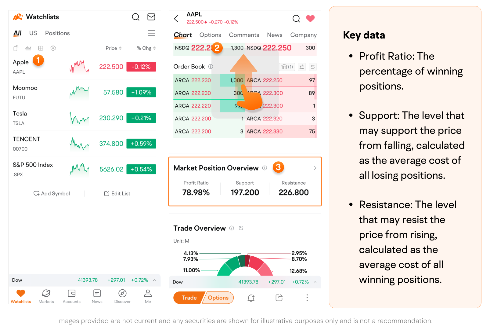 • Resistance: The level that may resist the price from rising, calculated as the average cost of all winning positions.