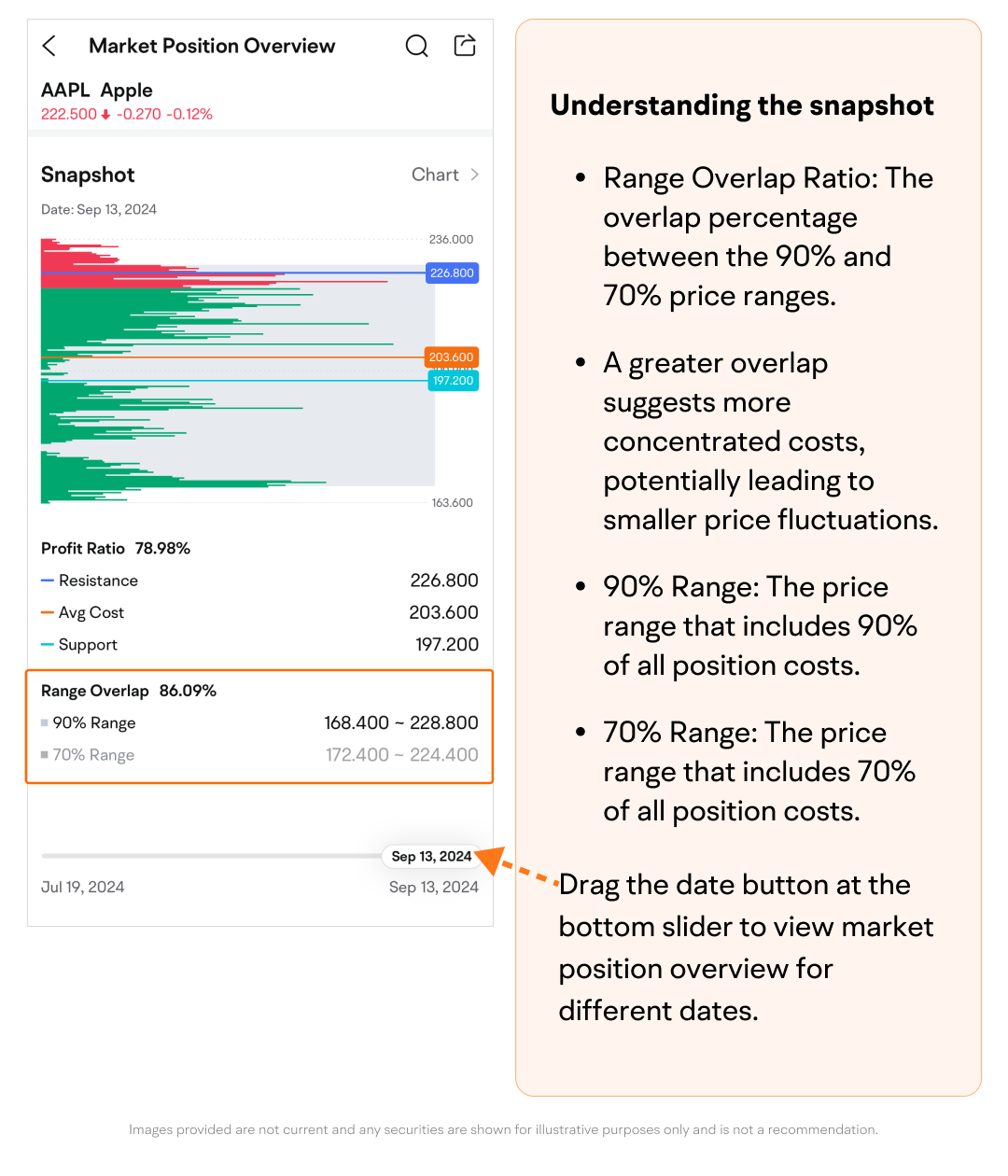 Path: Quotes page > Swipe up to find Market Position Overview.