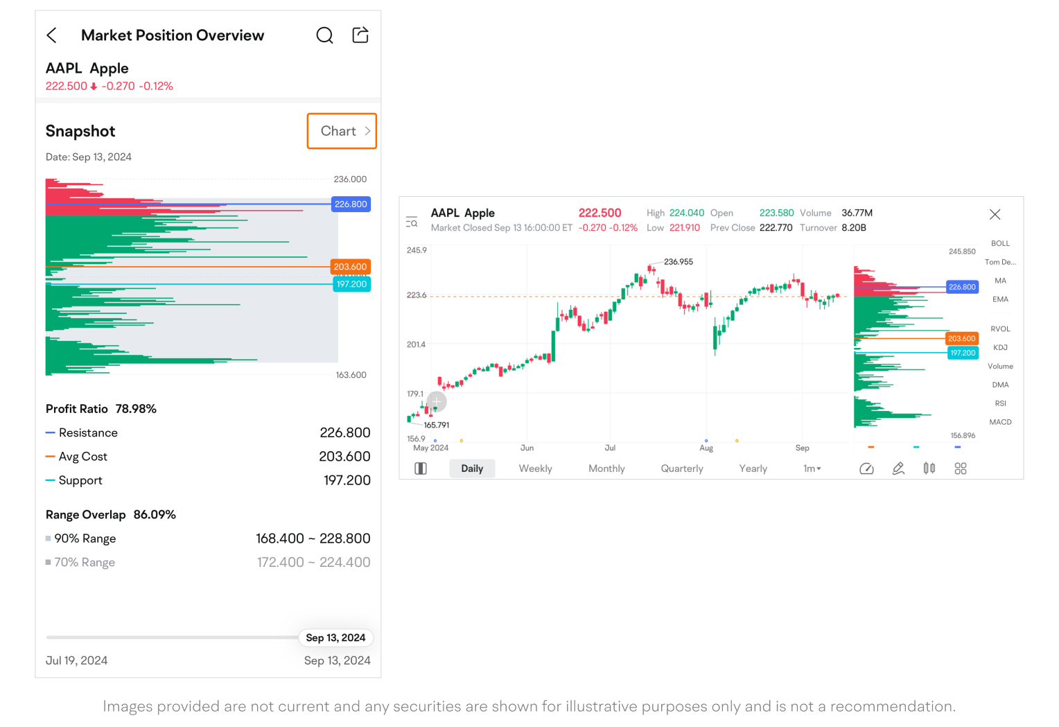 Tap "Chart >" at the top right of the snapshot to enter landscape orientation and juxtapose the daily price chart.