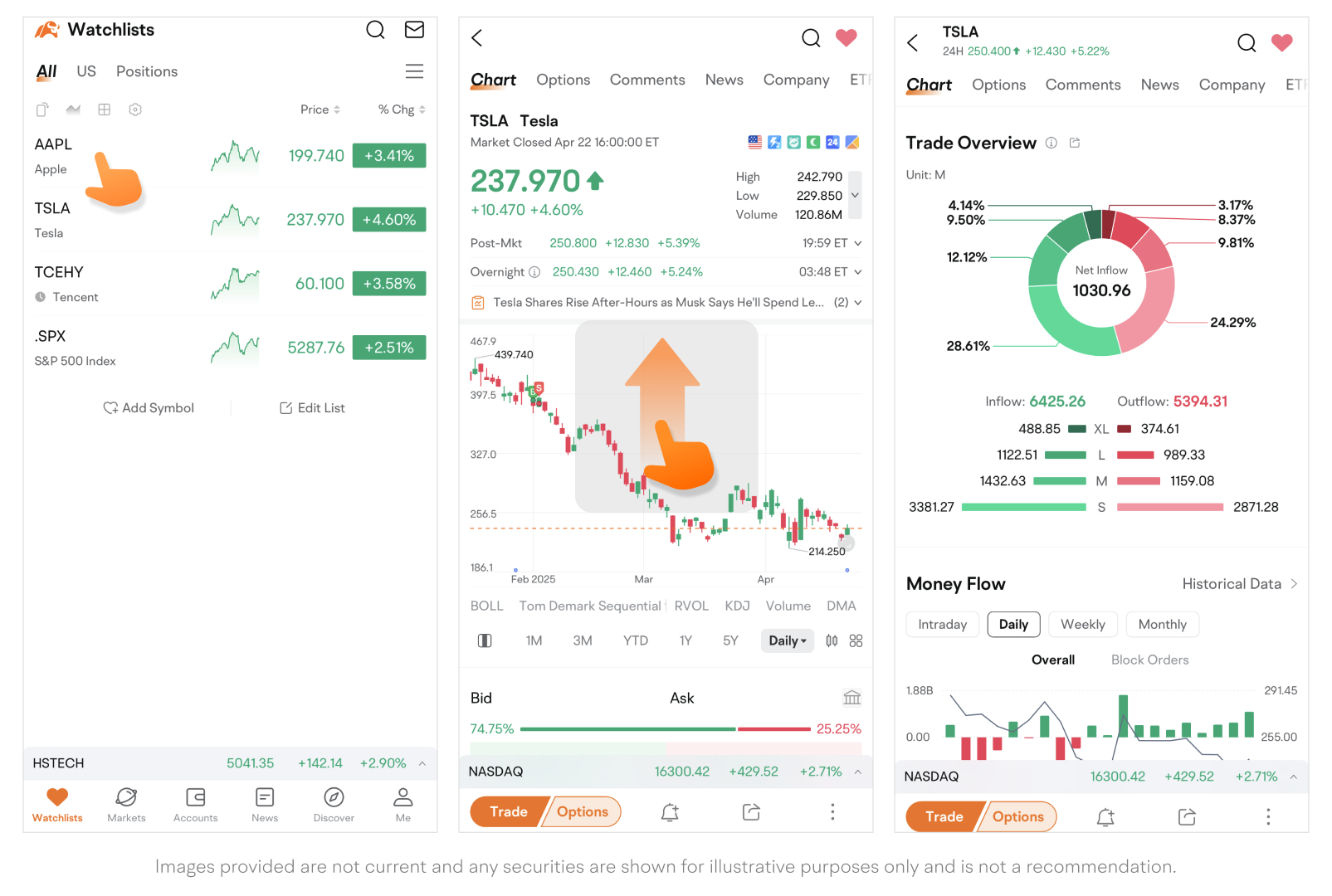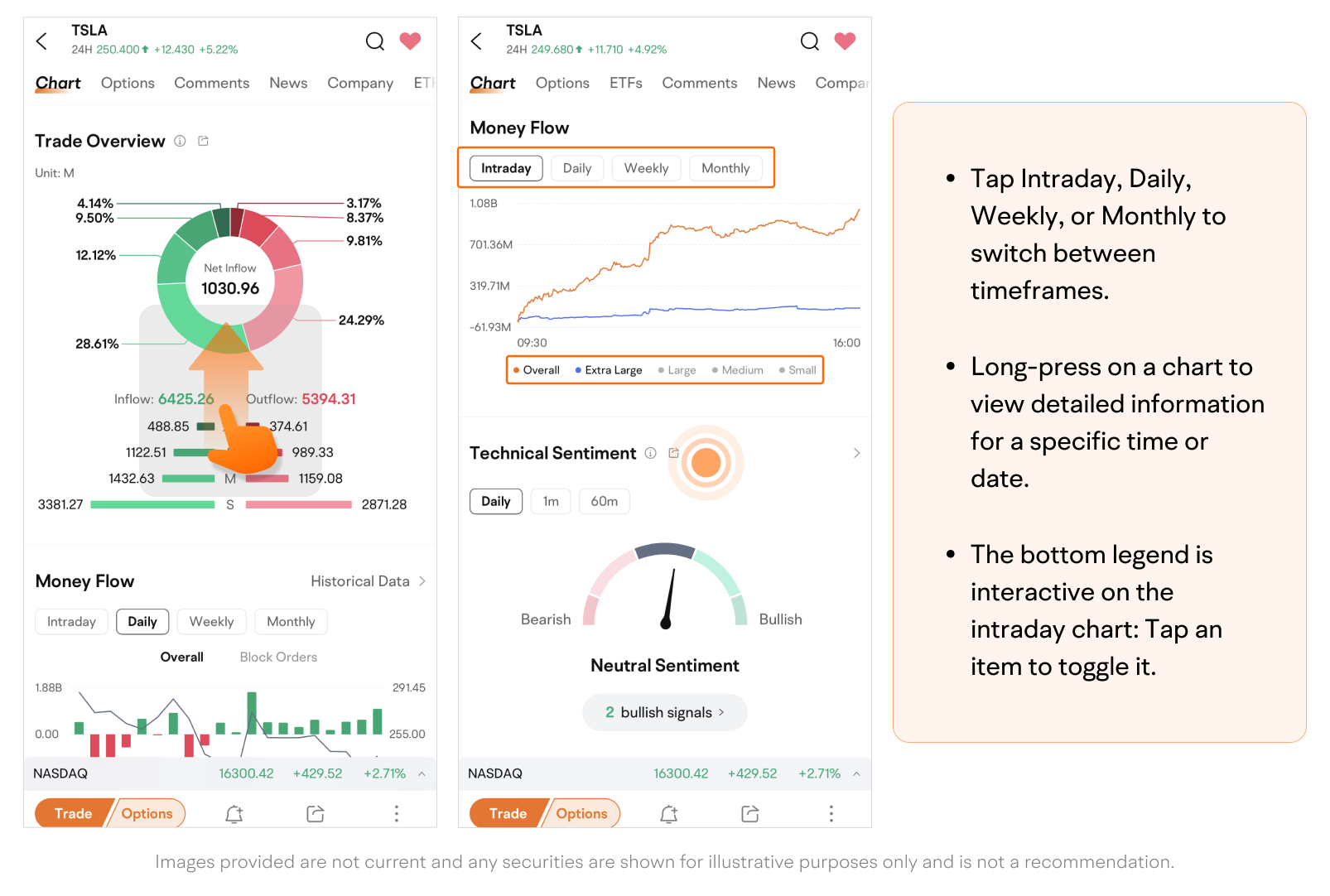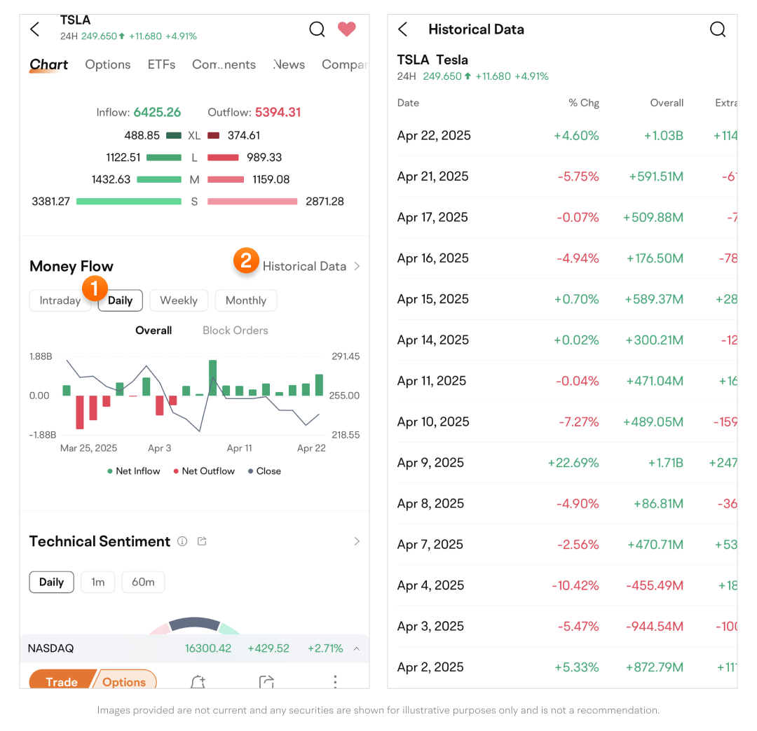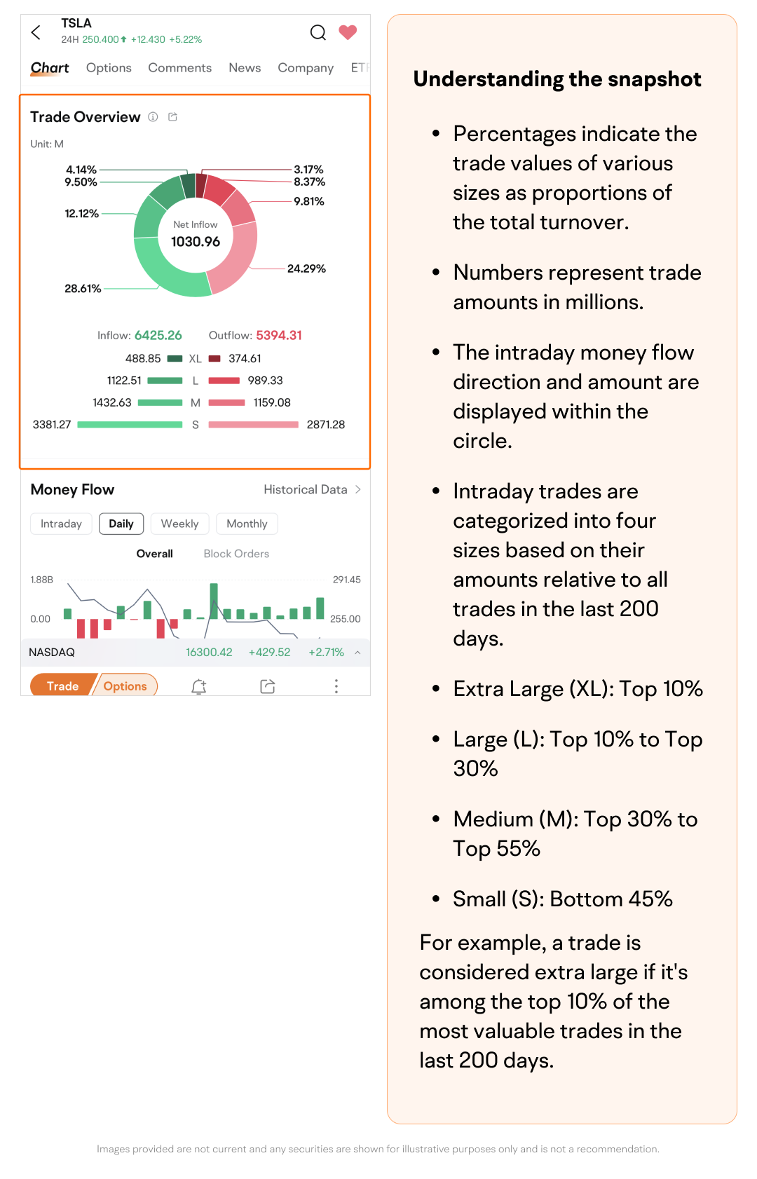 Path: Quotes page > Swipe up to find Trade Overview and Money Flow.