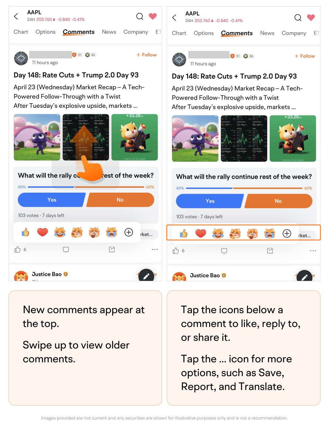 Tap the icons below a comment to like, reply to, or share it.