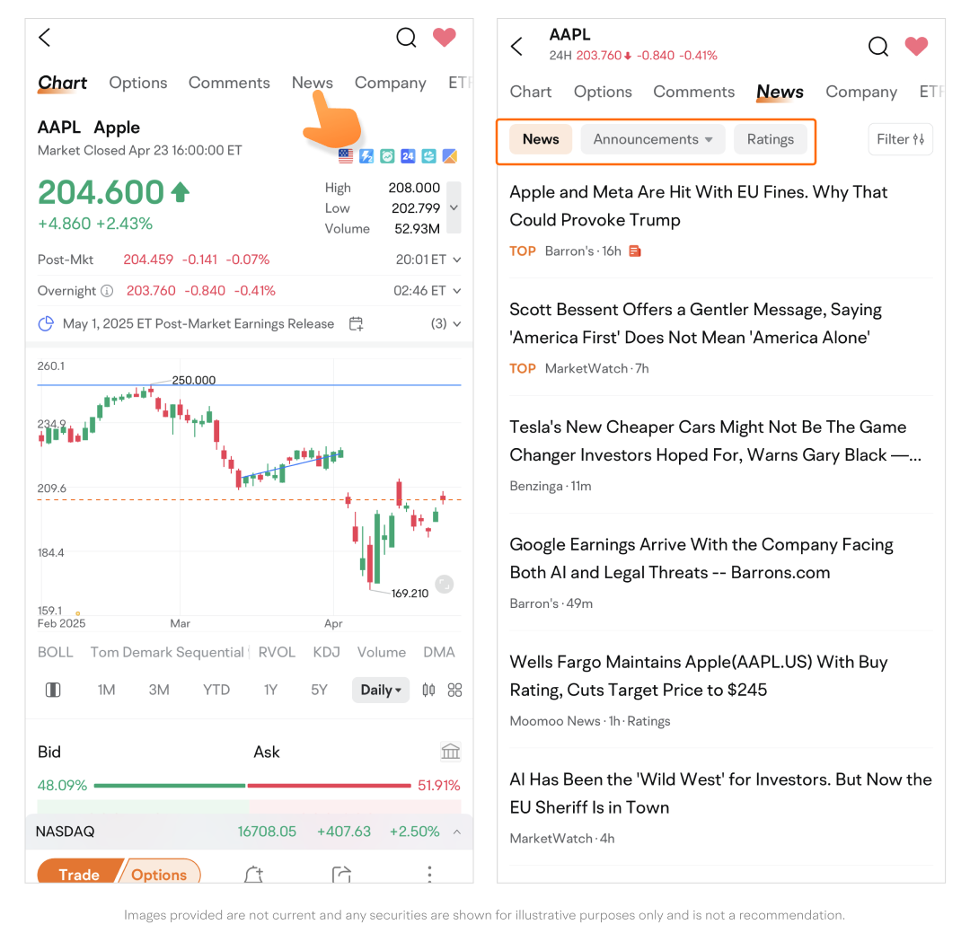 On a stock quotes page, tap News on the navigation bar to view news related to the current company from reputable sources such as Bloomberg, Dow Jones, and Reuters.