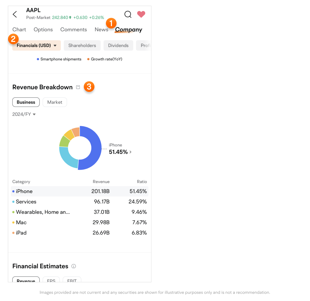 Path: Quotes page > Company > Financials > Swipe up to find Revenue Breakdown.