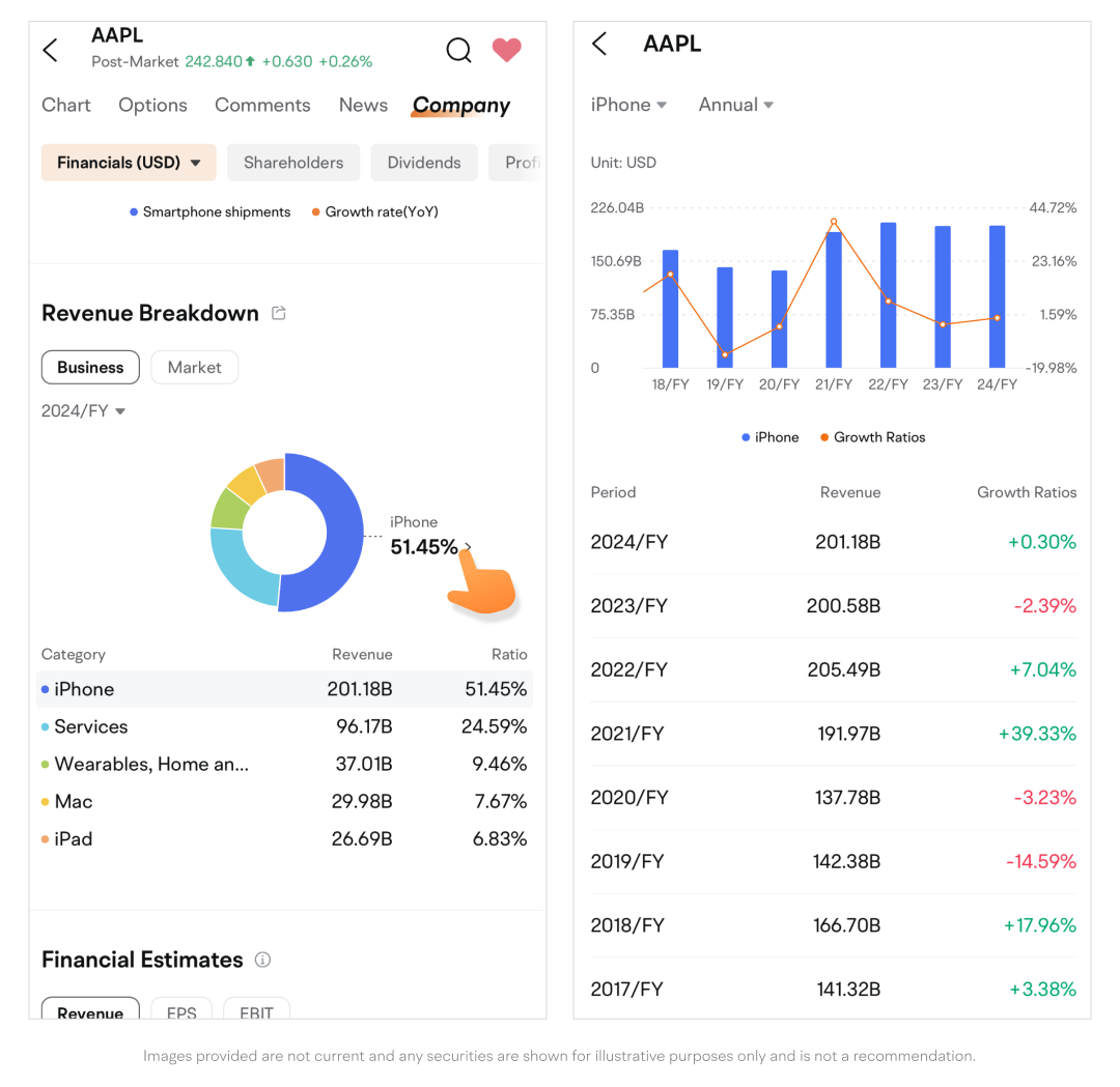 • Tap the > icon next to the pie chart to view quarterly or annual historical data and growth rates.
