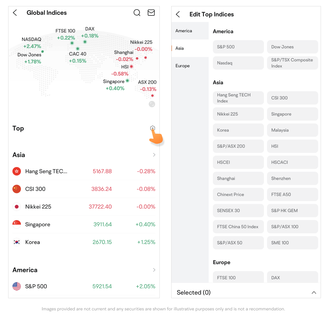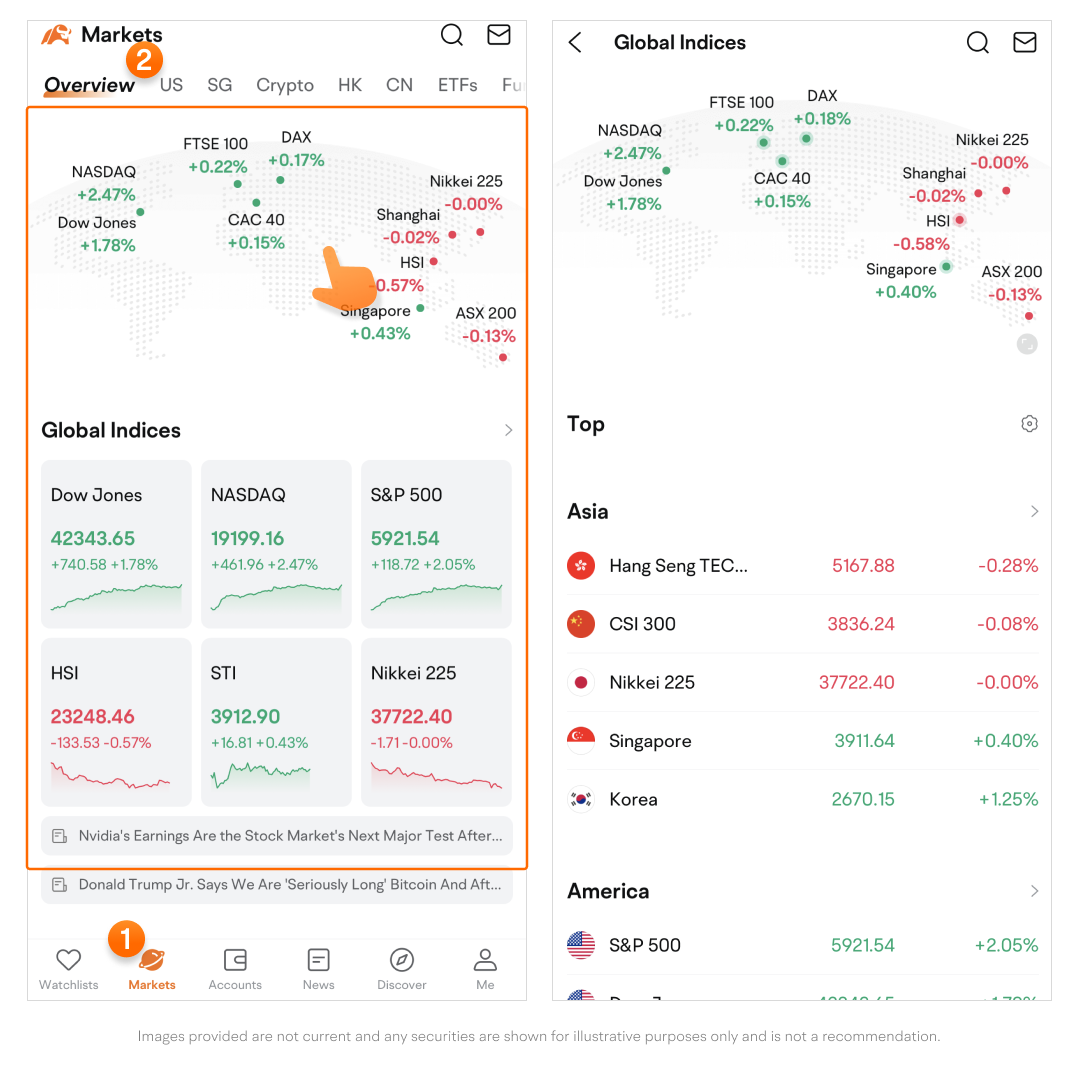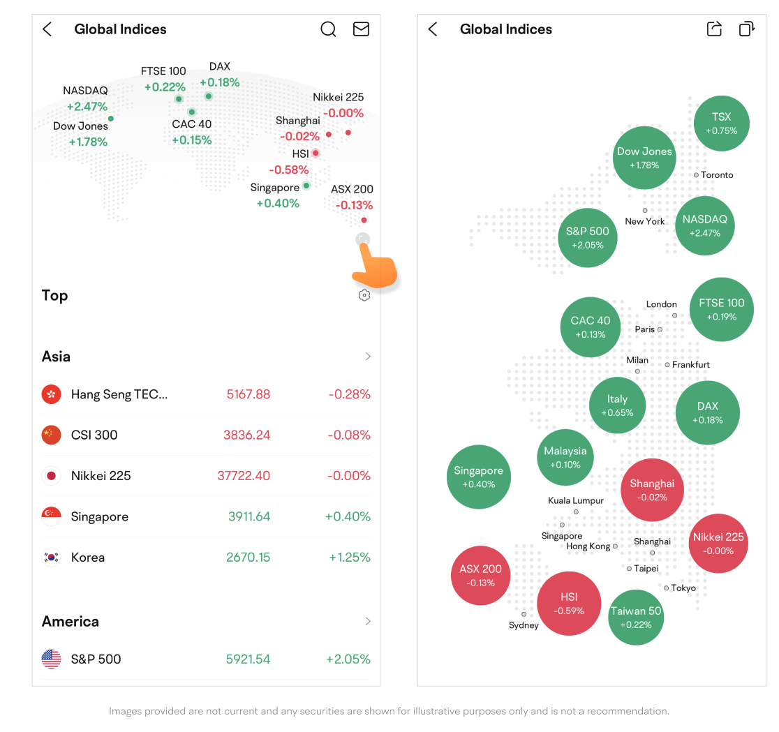 Tap the world map or the ">" icon next to Global Indices to access the detailed page for global indices.
