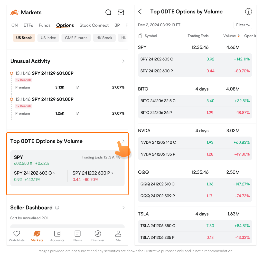 Tap the > icon to view more 0DTE options.
