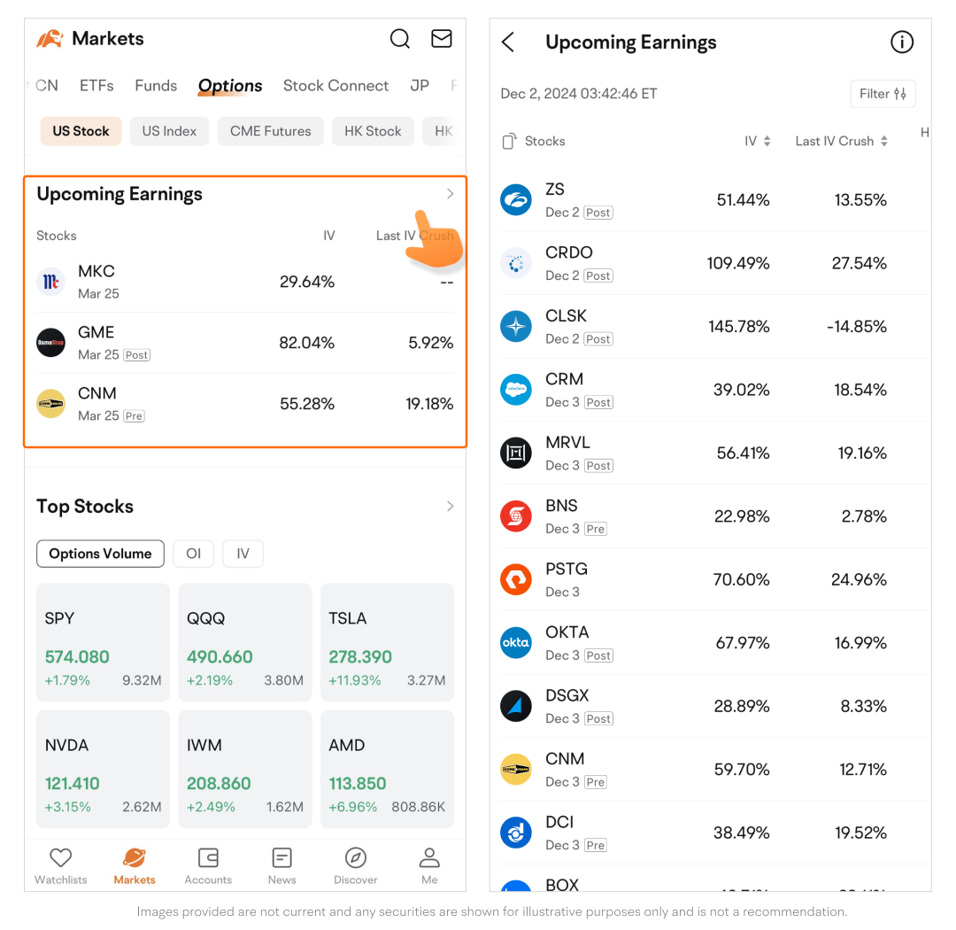 Displays companies anticipated to release earnings reports soon, along with their implied volatility (IV) and last IV crush data.