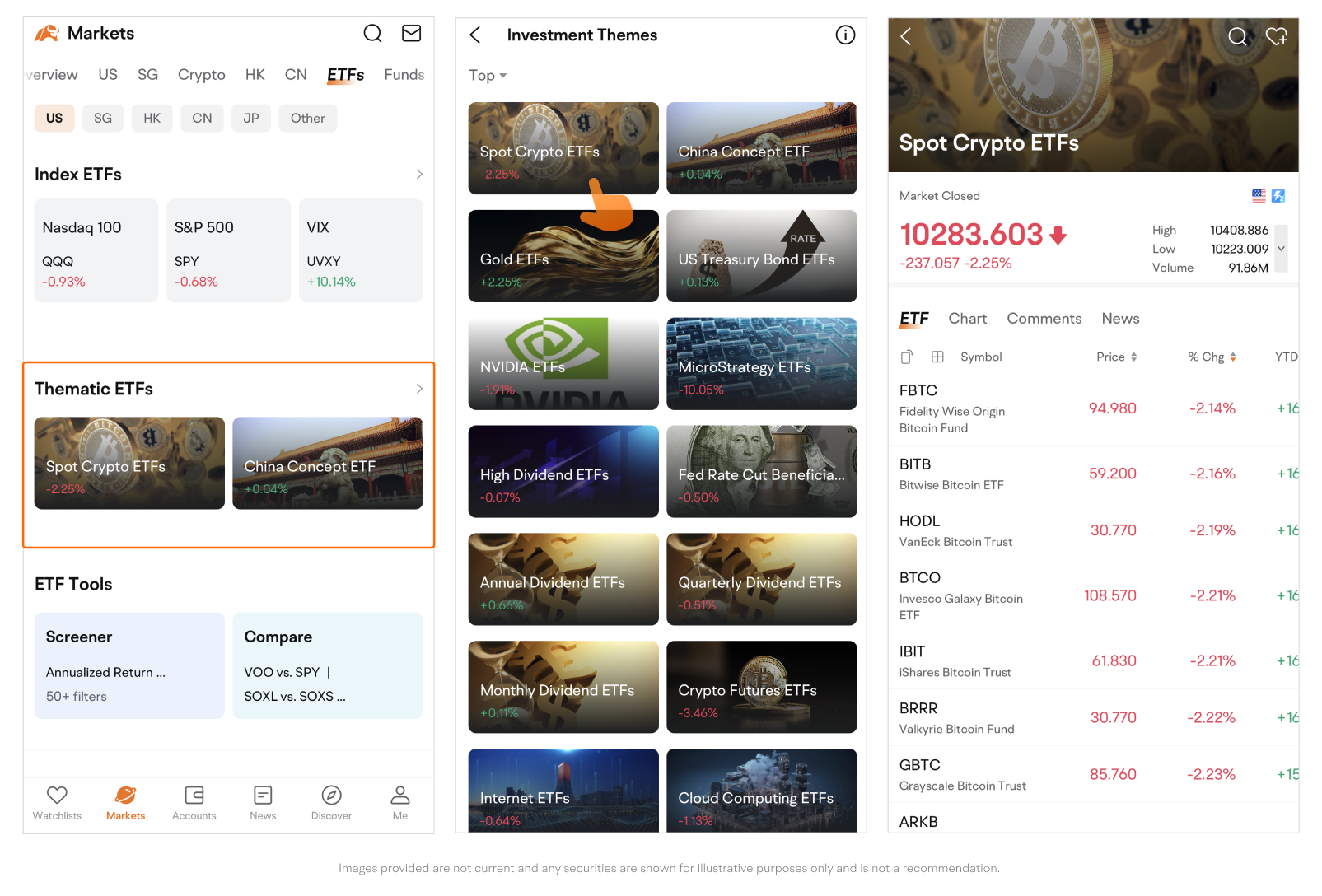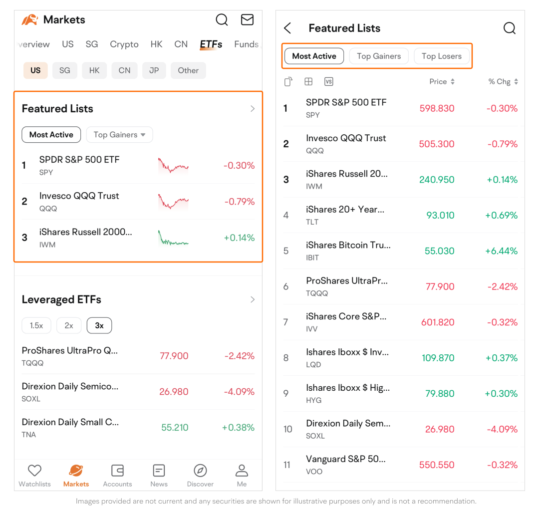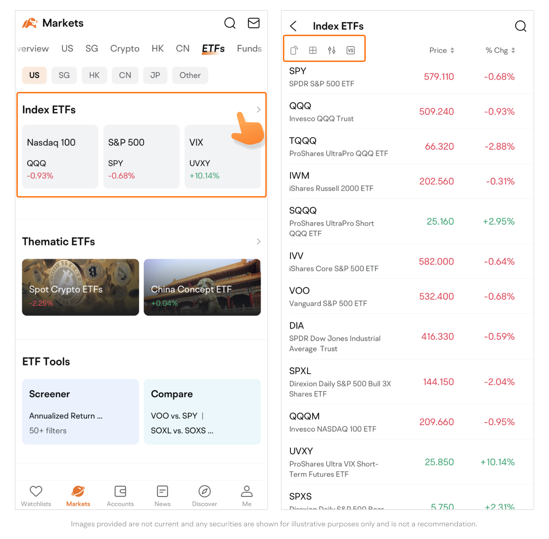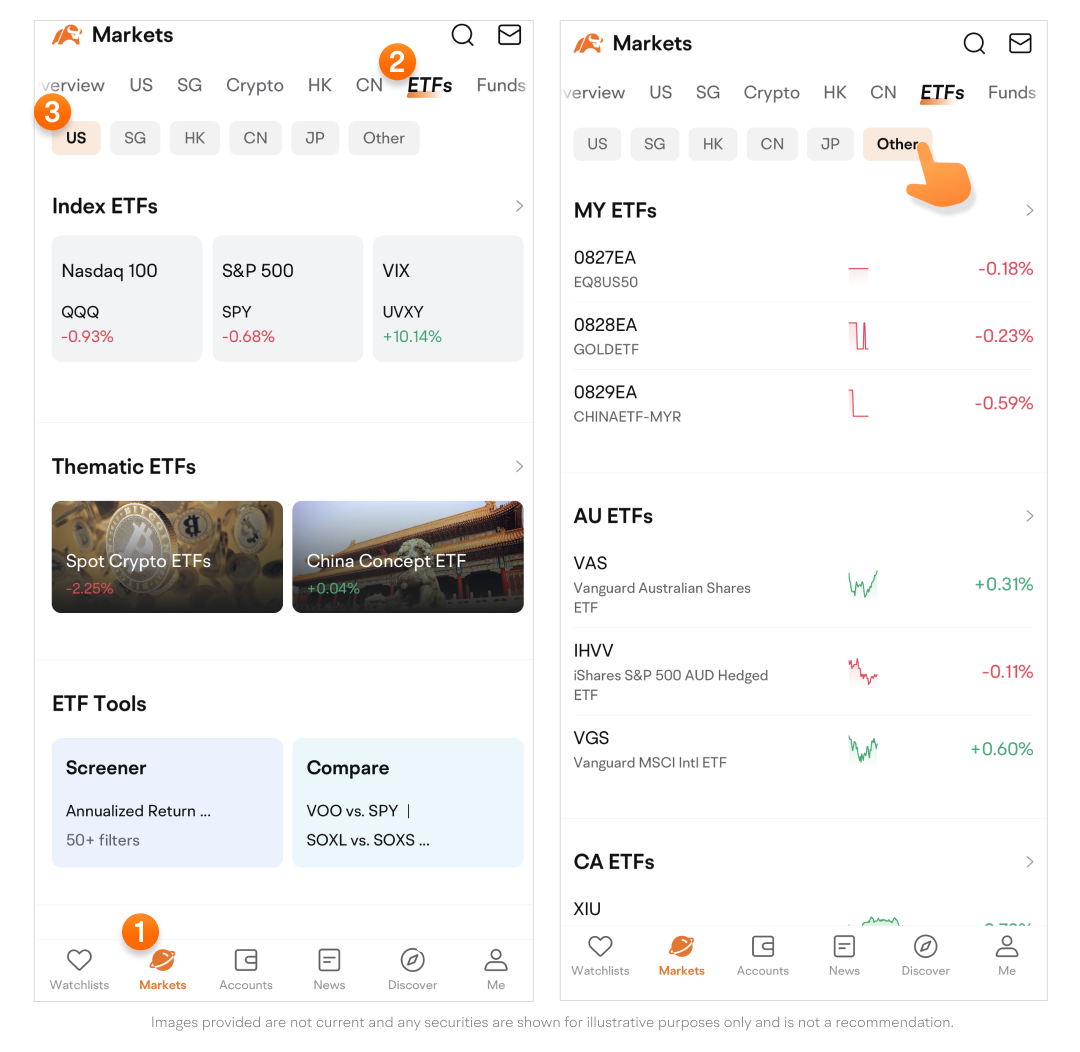 Path: Go to the Markets page > Tap ETFs on the top navigation bar.