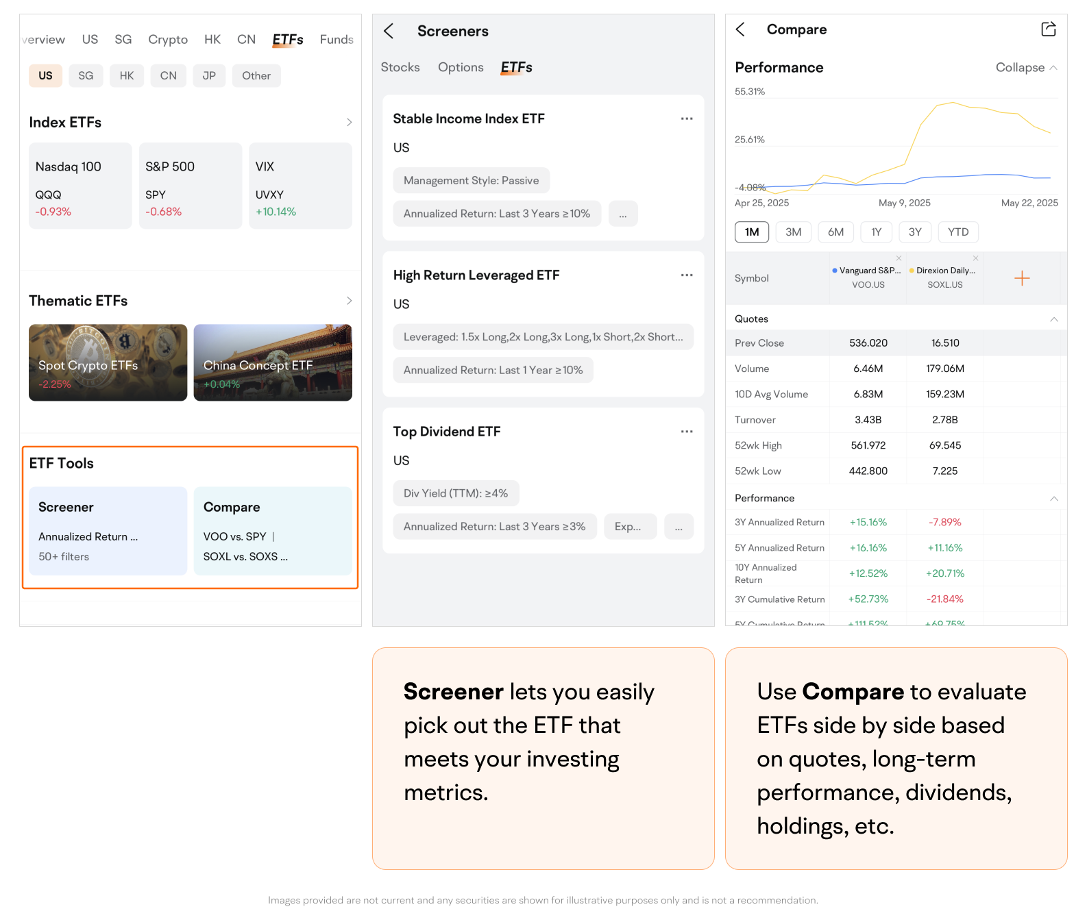 Use Compare to evaluate ETFs side by side based on quotes, long-term performance, dividends, holdings, etc.