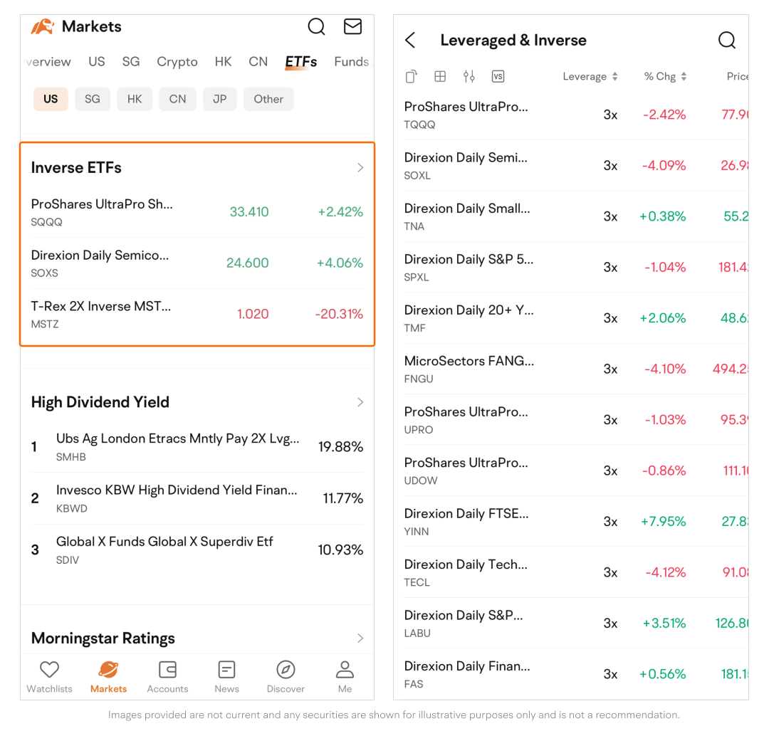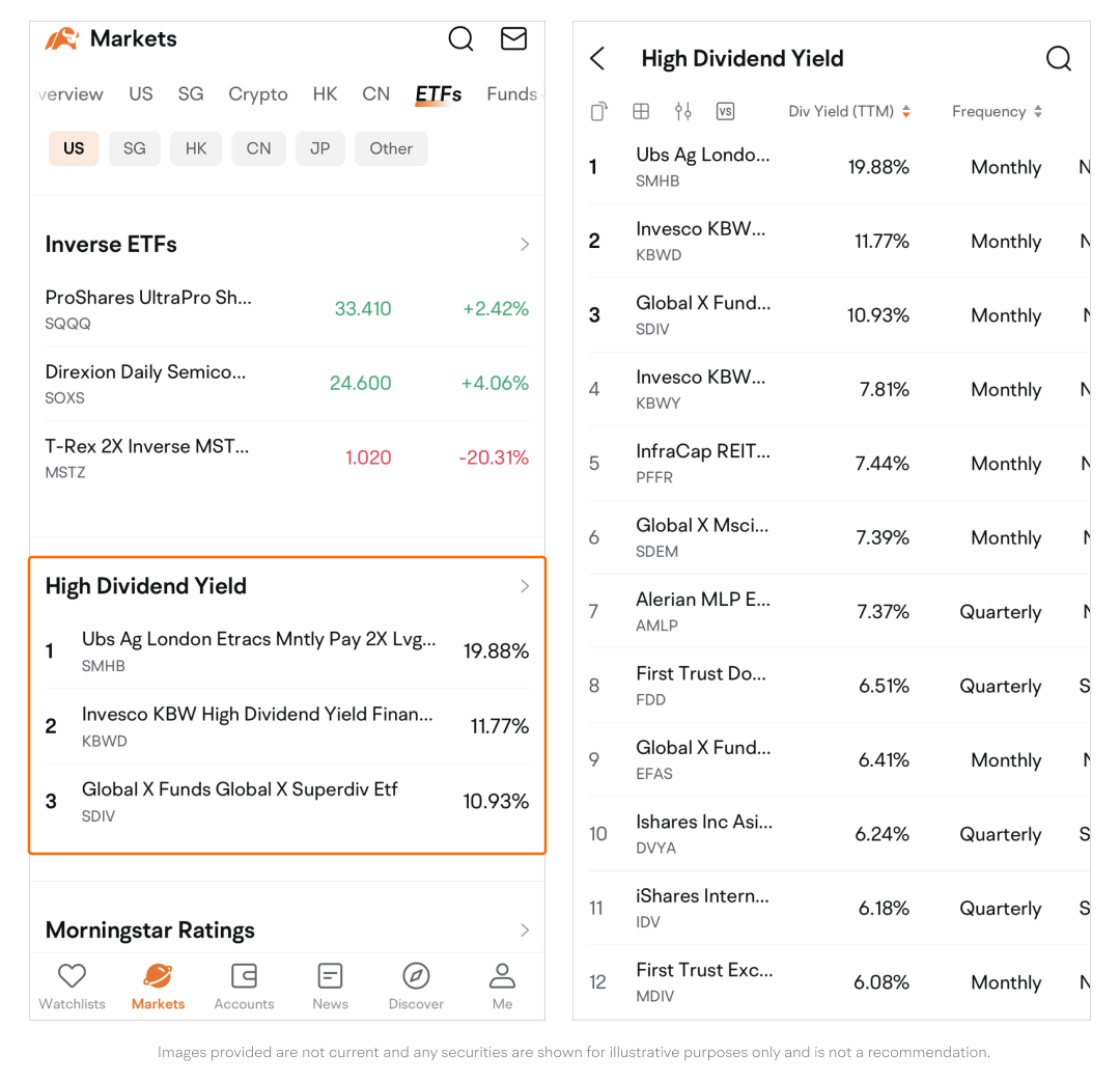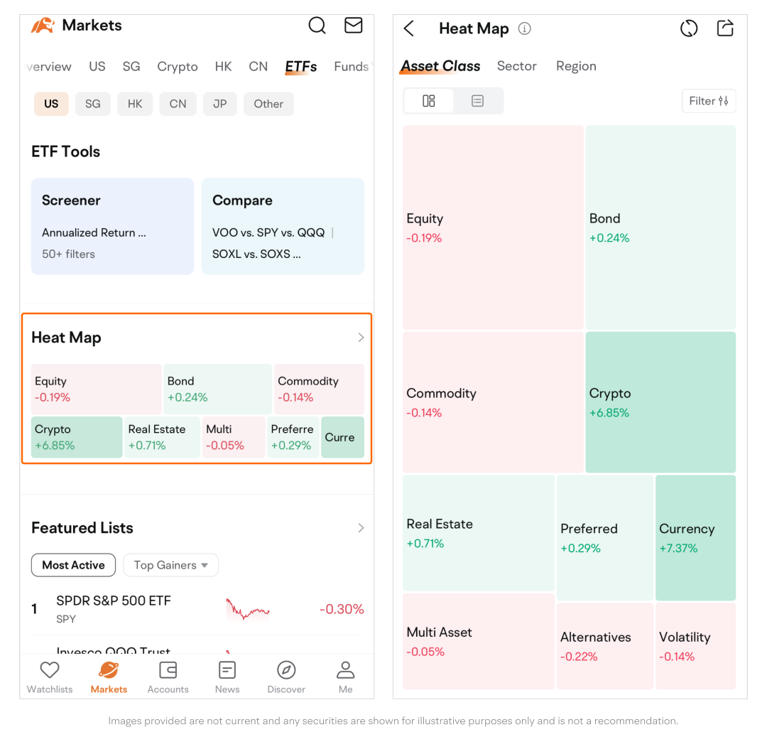 With the ETFs page, you can easily have an overview of ETFs across different markets and potentially find the product that suits your investing preferences.