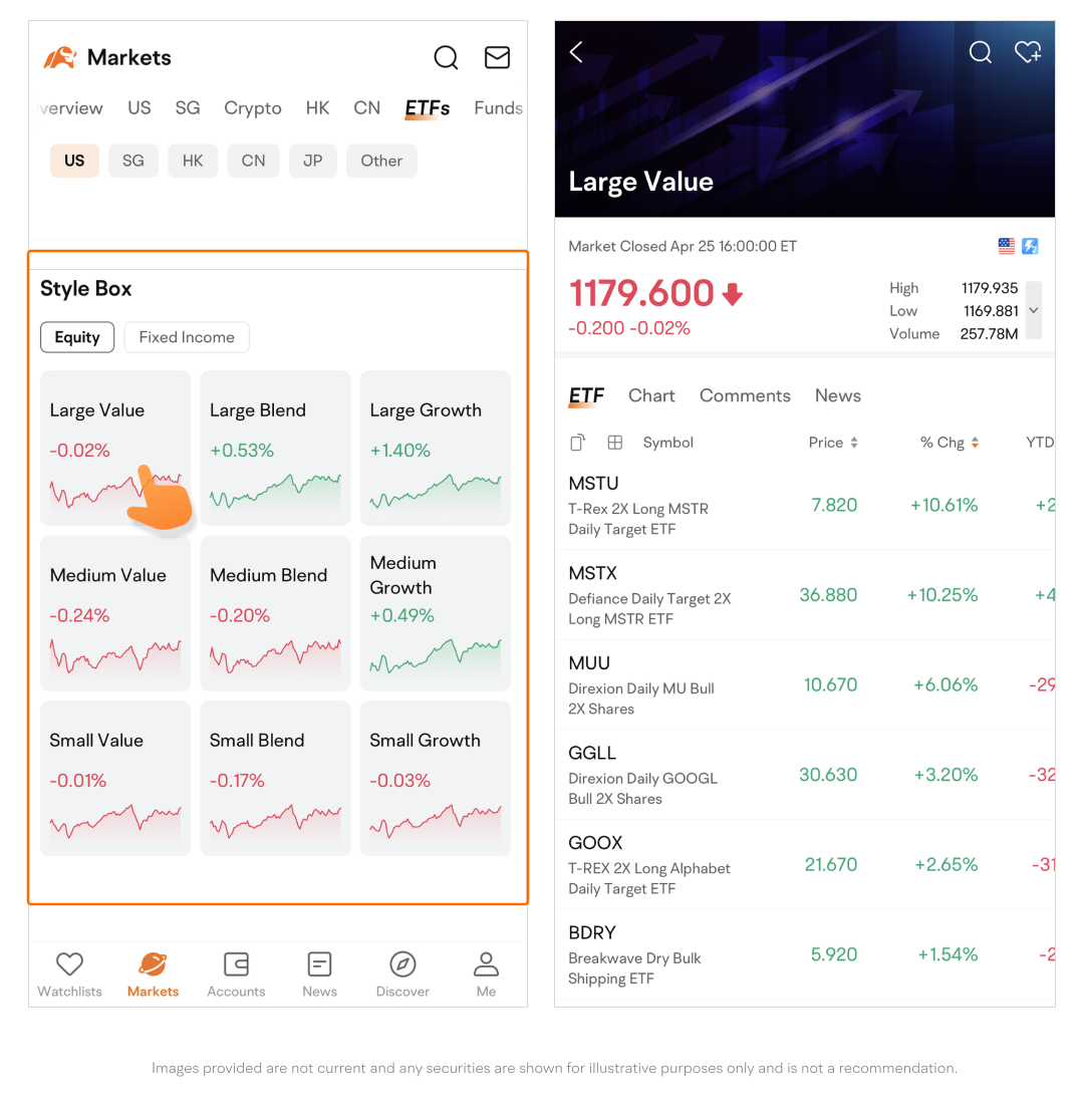 Style Box allows you to quickly pick out equity and fixed-income ETFs that match your investing preferences with a 3x3 style grid.