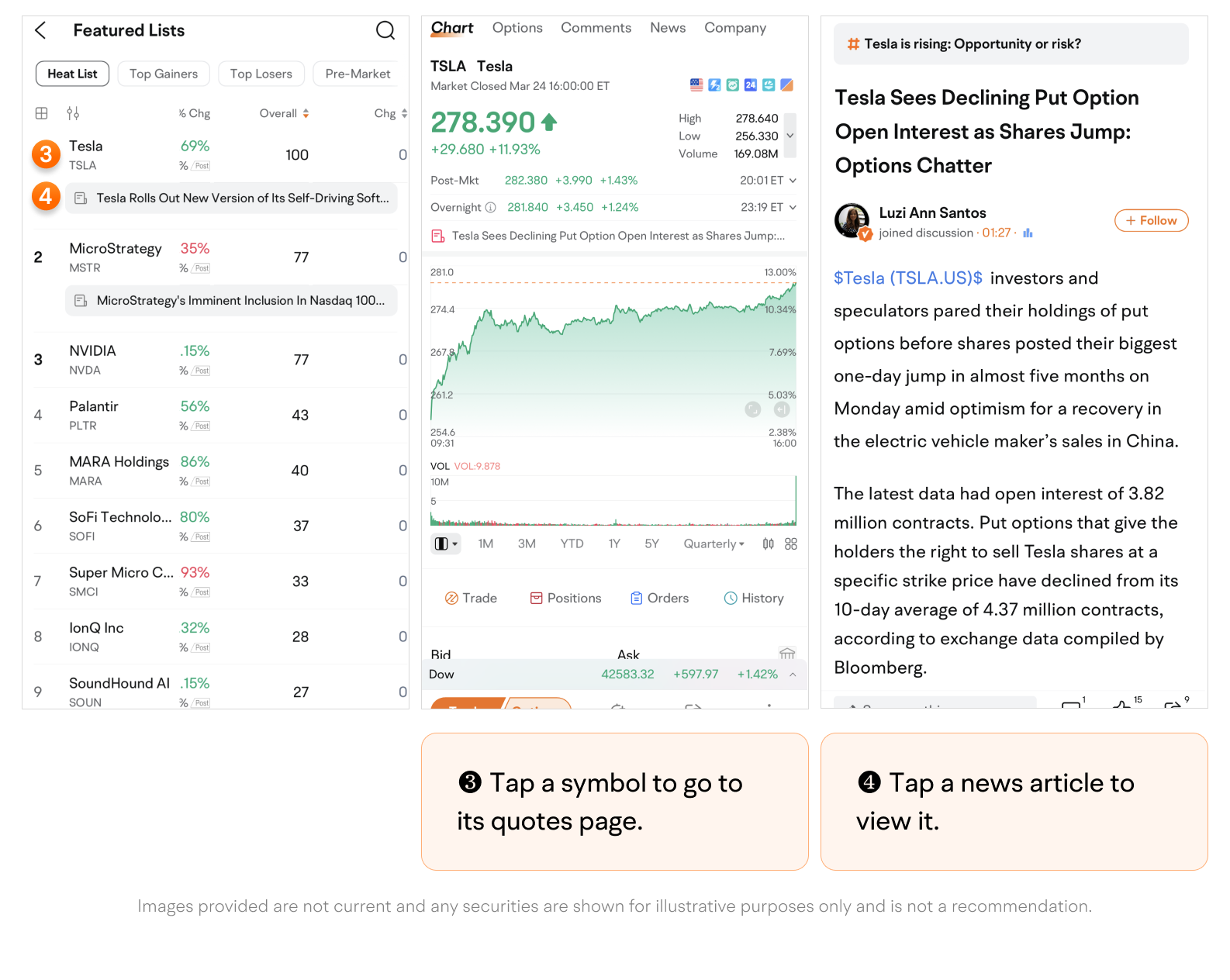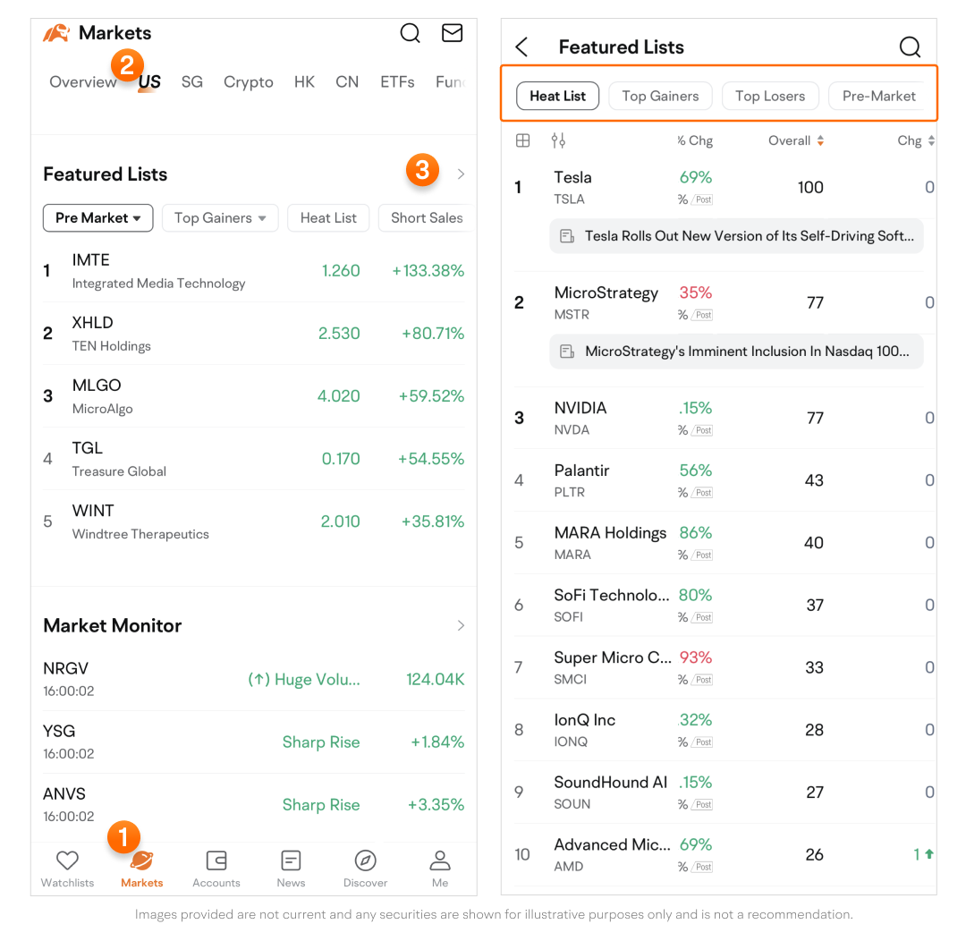 Featured Lists include rankings such as the Heat List, Top Gainers, Top Losers, Short Sales, and 5min Movers. These lists can help investors grasp market dynamics and potentially identify symbols for trading.