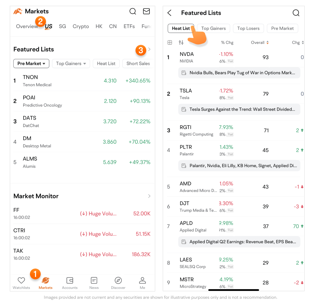 Path: Markets > US or select another market > Swipe up to find Featured Lists > Select Heat List.