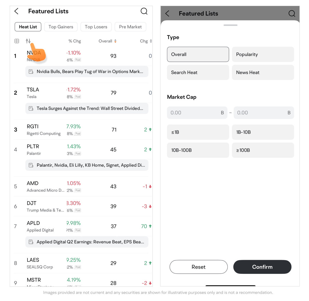 Heat List presents trending stocks based on various market factors, including news coverage, trading popularity, and search frequency. The list is updated in real time.