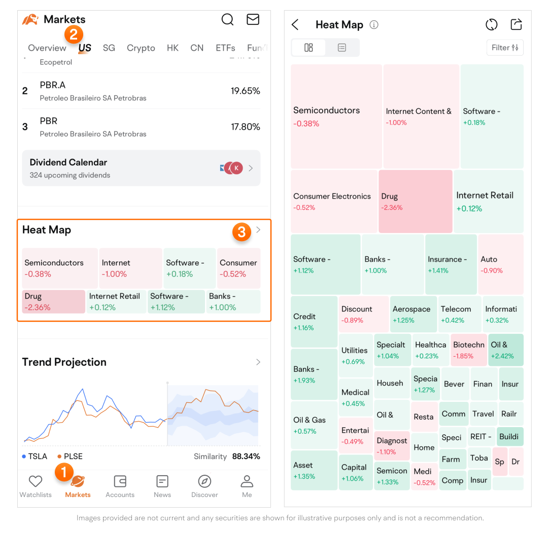 Path: Markets > US or select another market > Swipe up to find Heat Map.