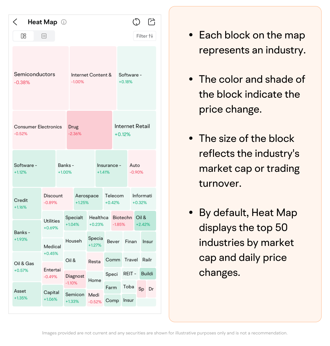 • By default, Heat Map displays the top 50 industries by market cap and daily price changes.