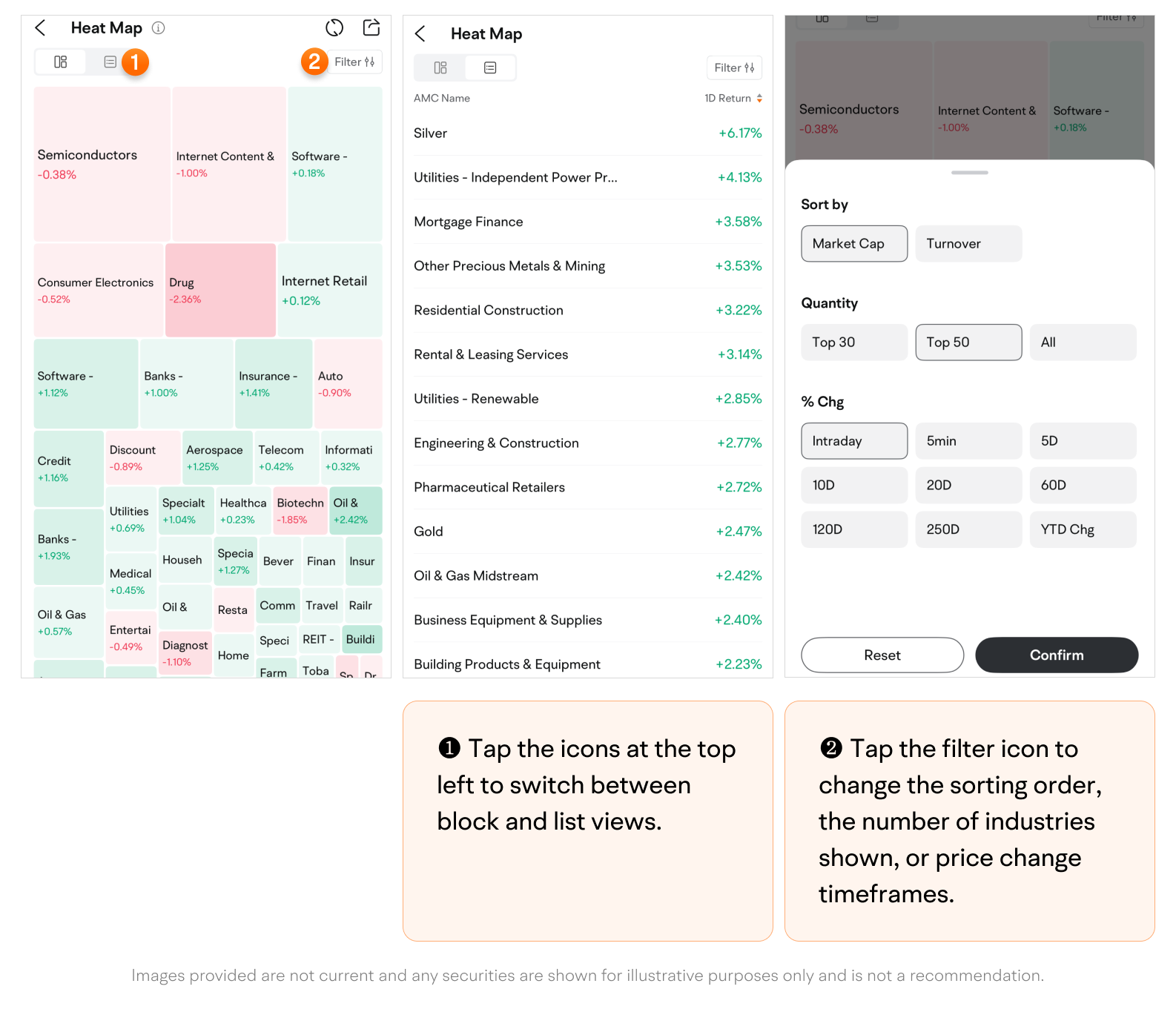 • Tap the filter icon to change the sorting order, the number of industries shown, or price change timeframes.