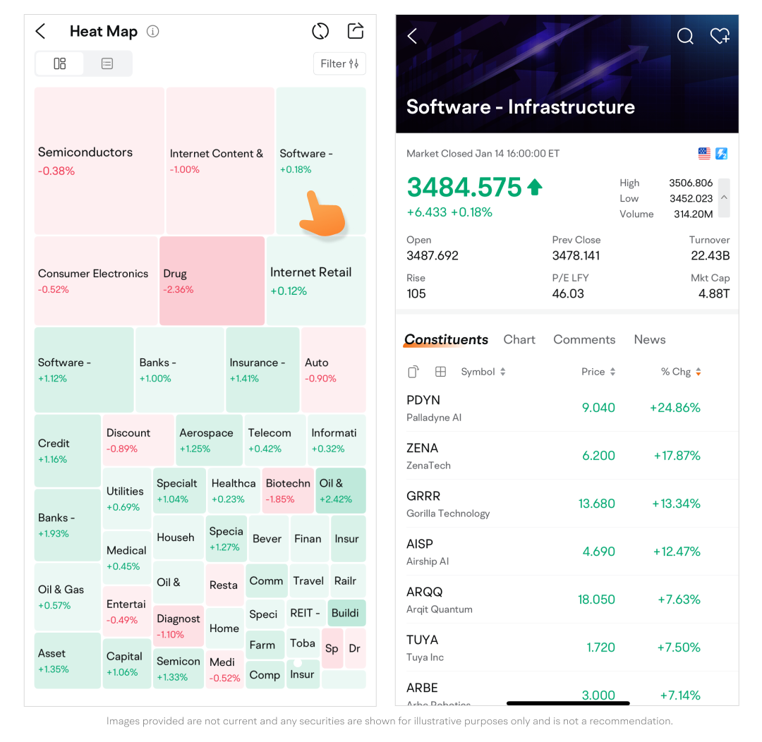 • Tap a block on the Heat Map page to access its quotes page, where you can view industry constituents, the price chart, news, and comments.