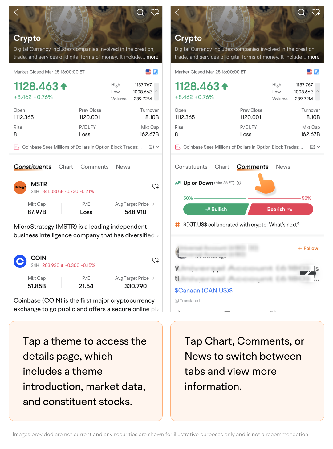 • Tap a theme to access the details page, which includes a theme introduction, market data, and three featured constituent stocks. Swipe up to see a complete list of constituents and the criteria for their inclusion.