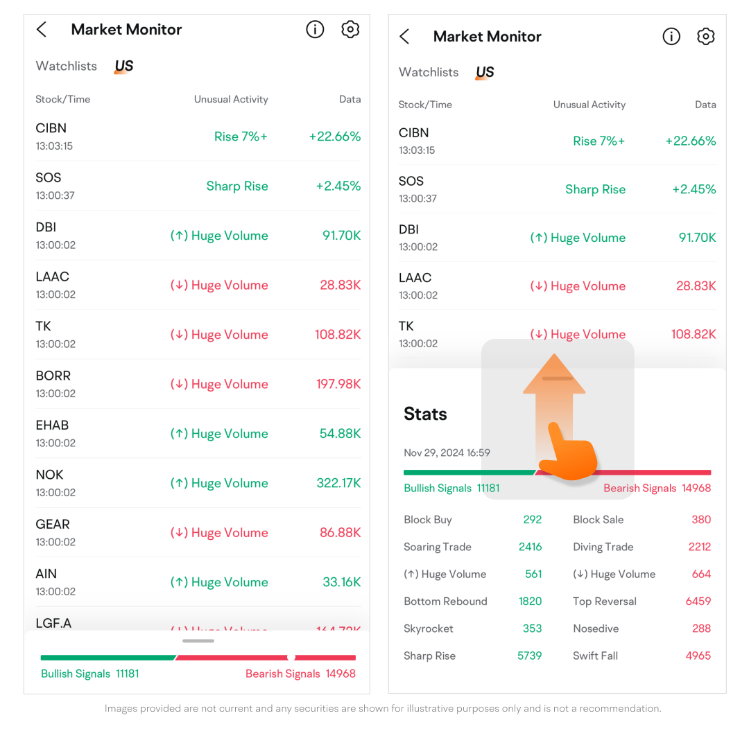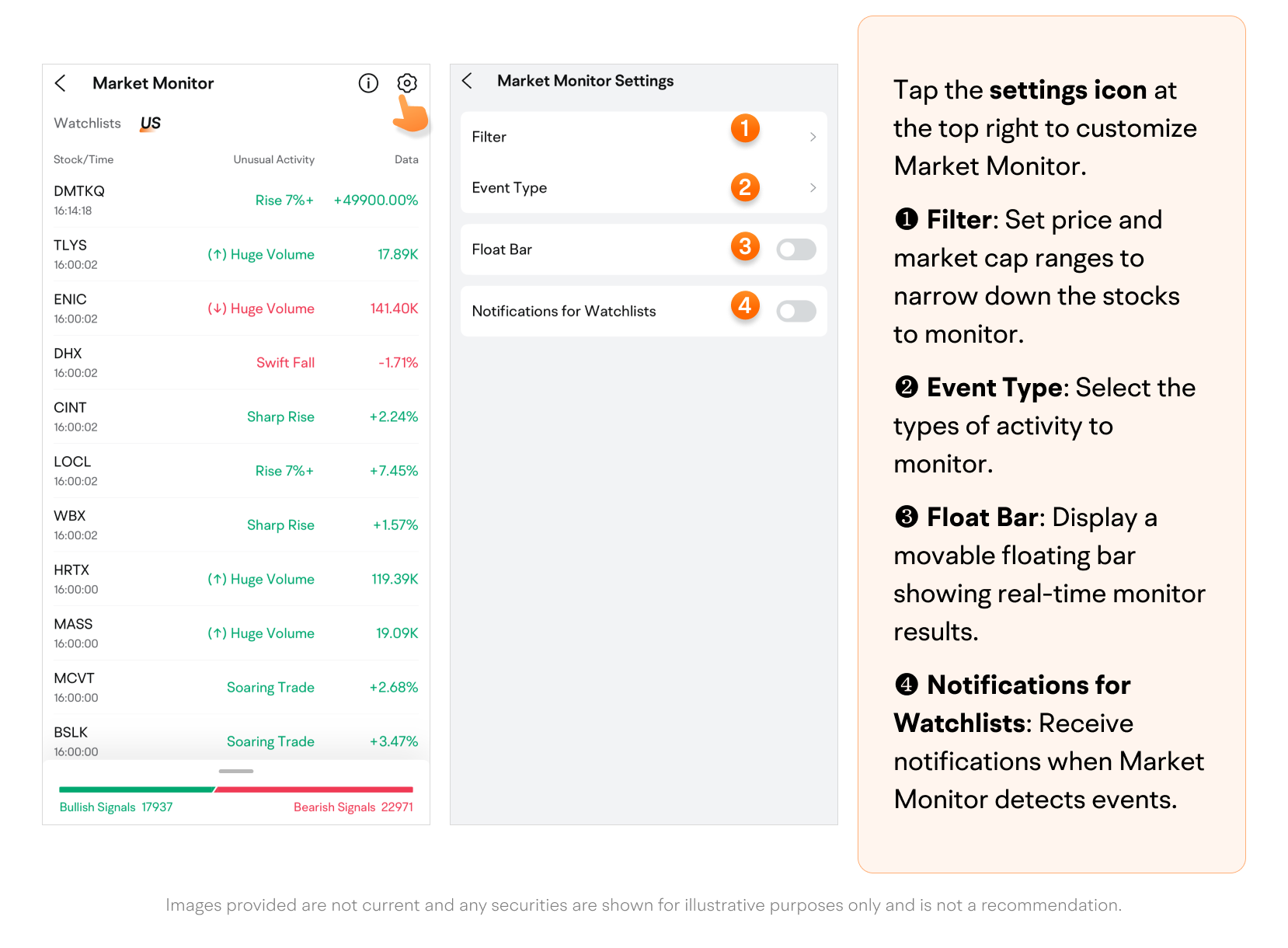 • Filter: Set price and market cap ranges to narrow down the stocks to monitor.