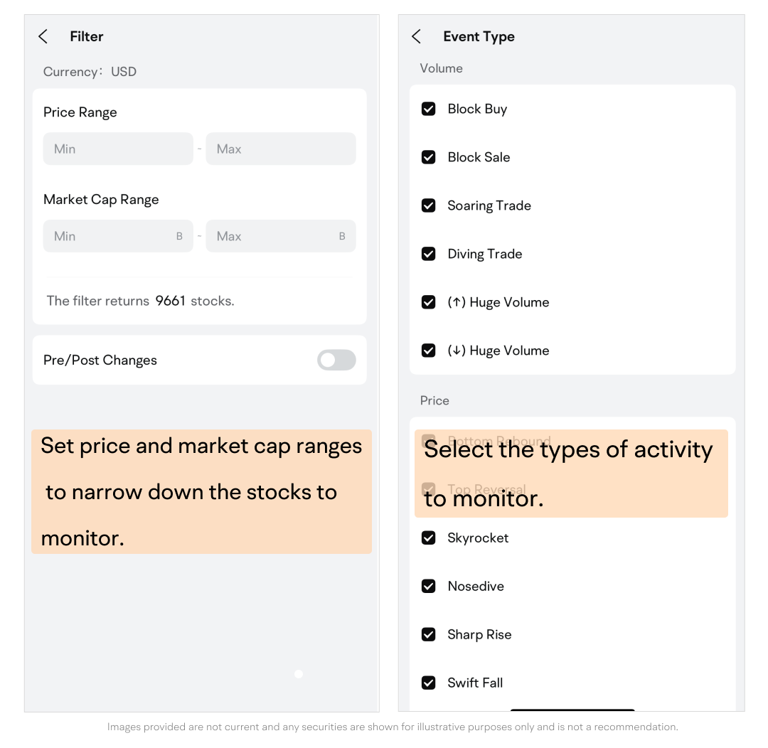• Event Type: Select event types to monitor, such as usual volumes and price movements.