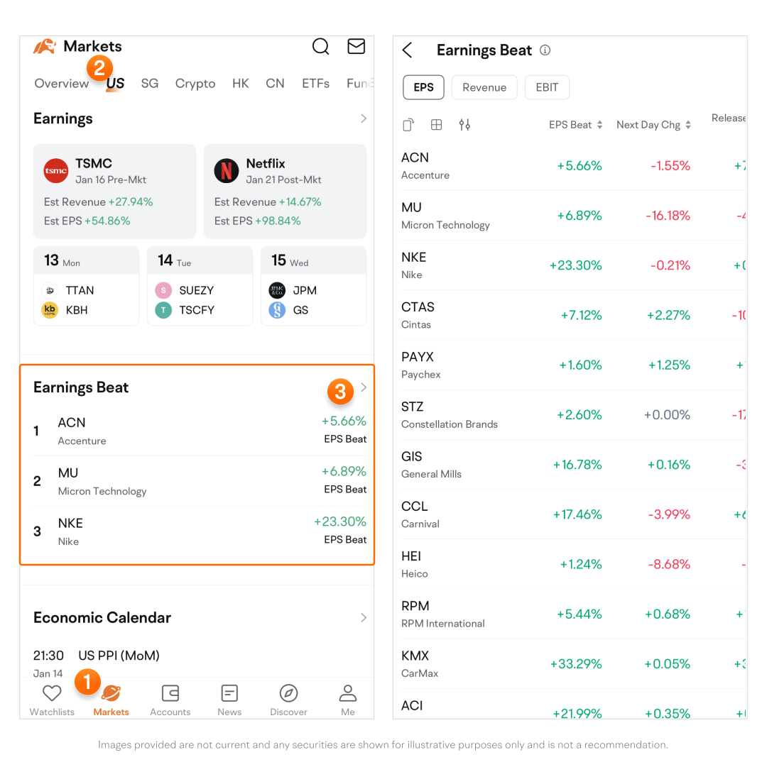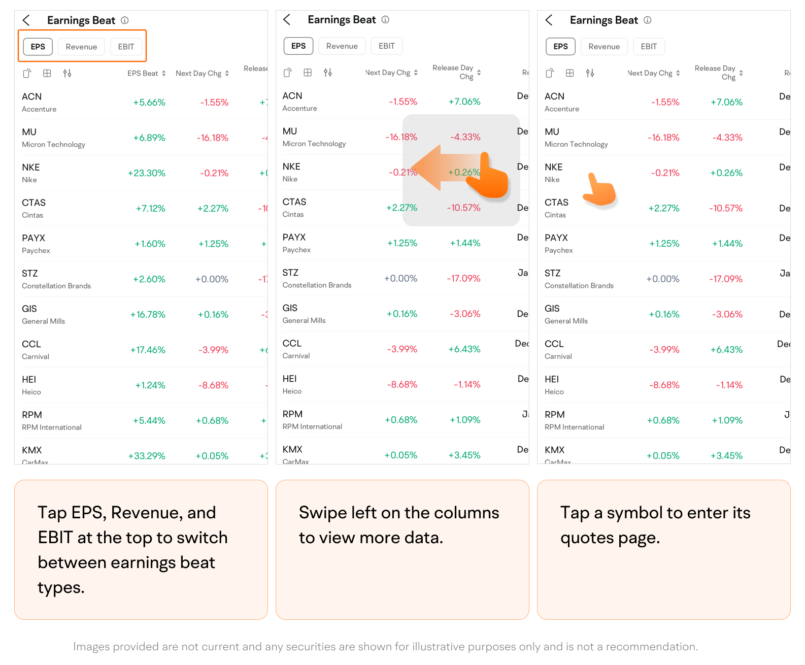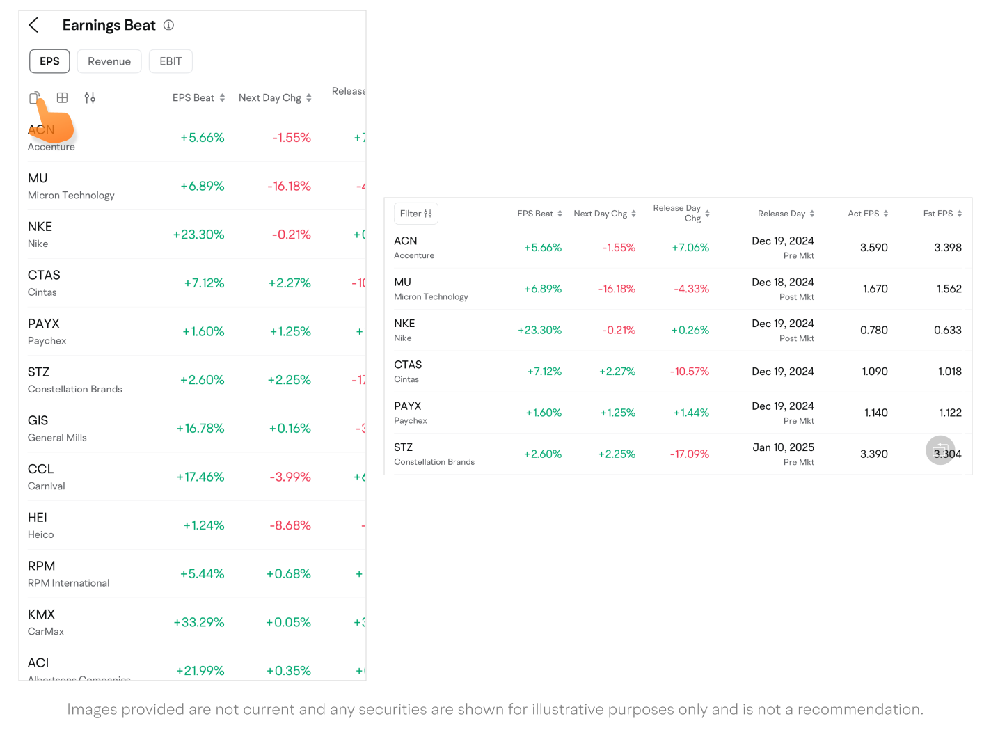 • Tap Earnings Per Share(EPS), Revenue, and Earnings Before Interest and Taxes(EBIT) at the top to switch between earnings beat types.
