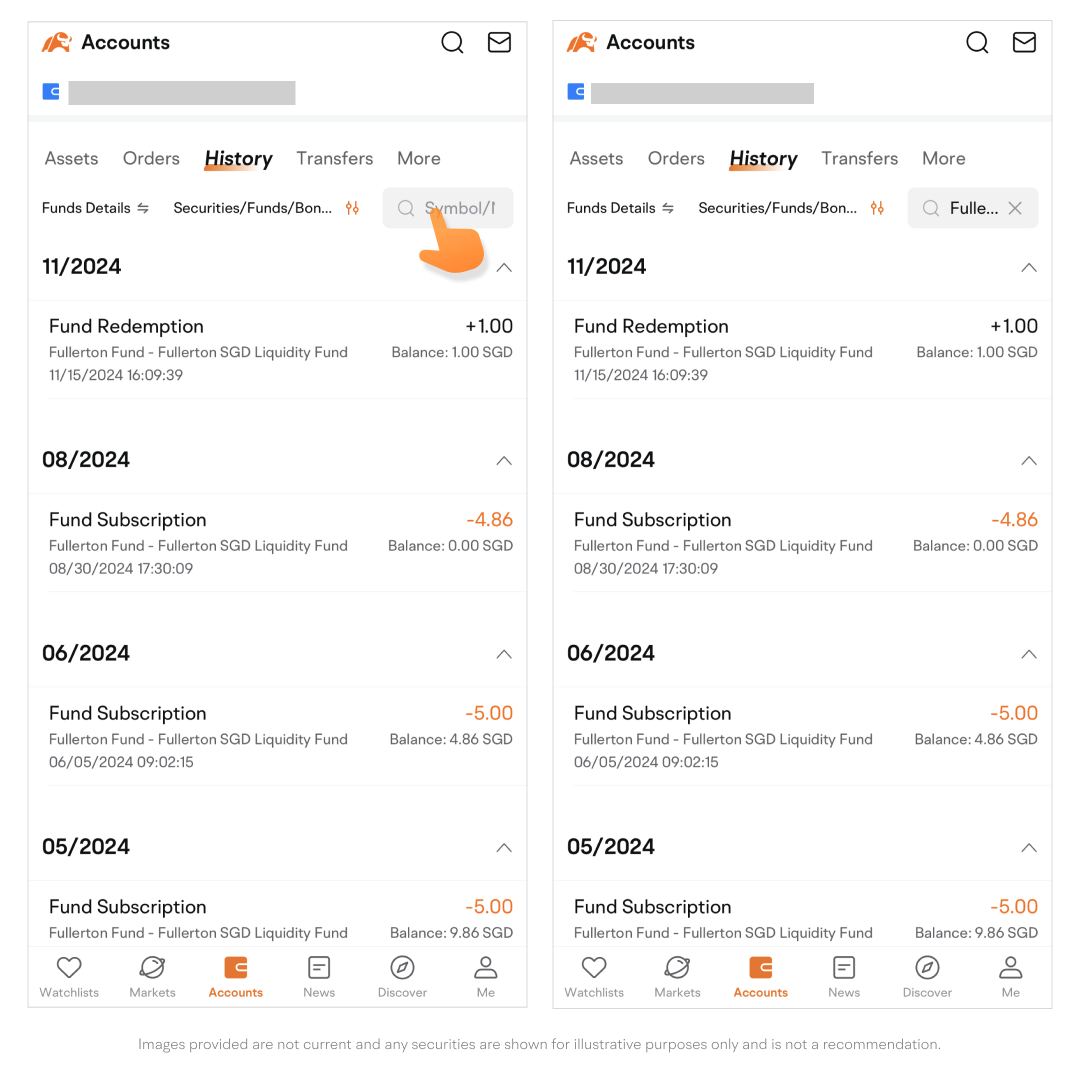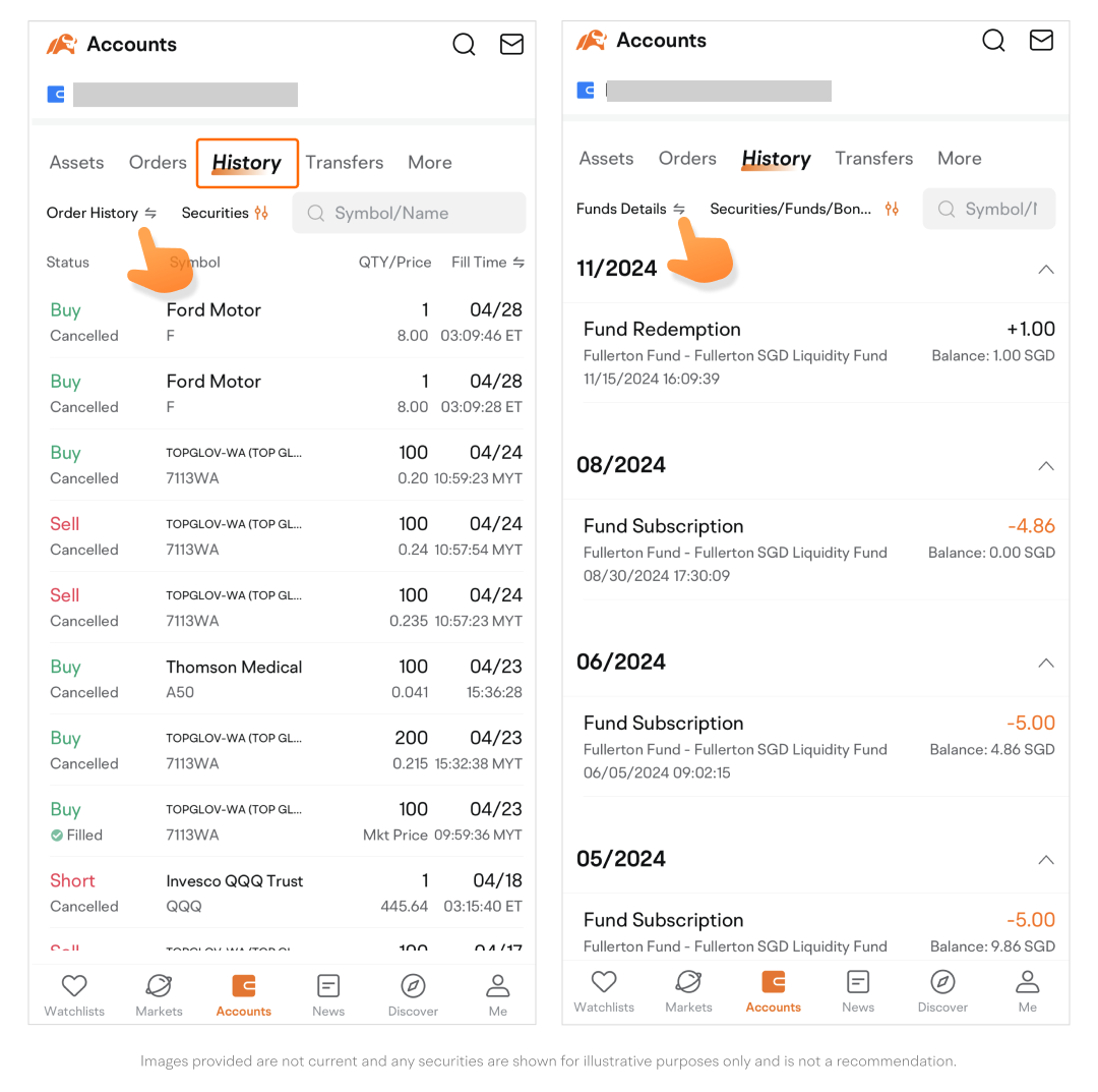 • By default, you will arrive on the Order History subpage. To switch to the Funds Details subpage, tap Order History ⇆, and vice versa.