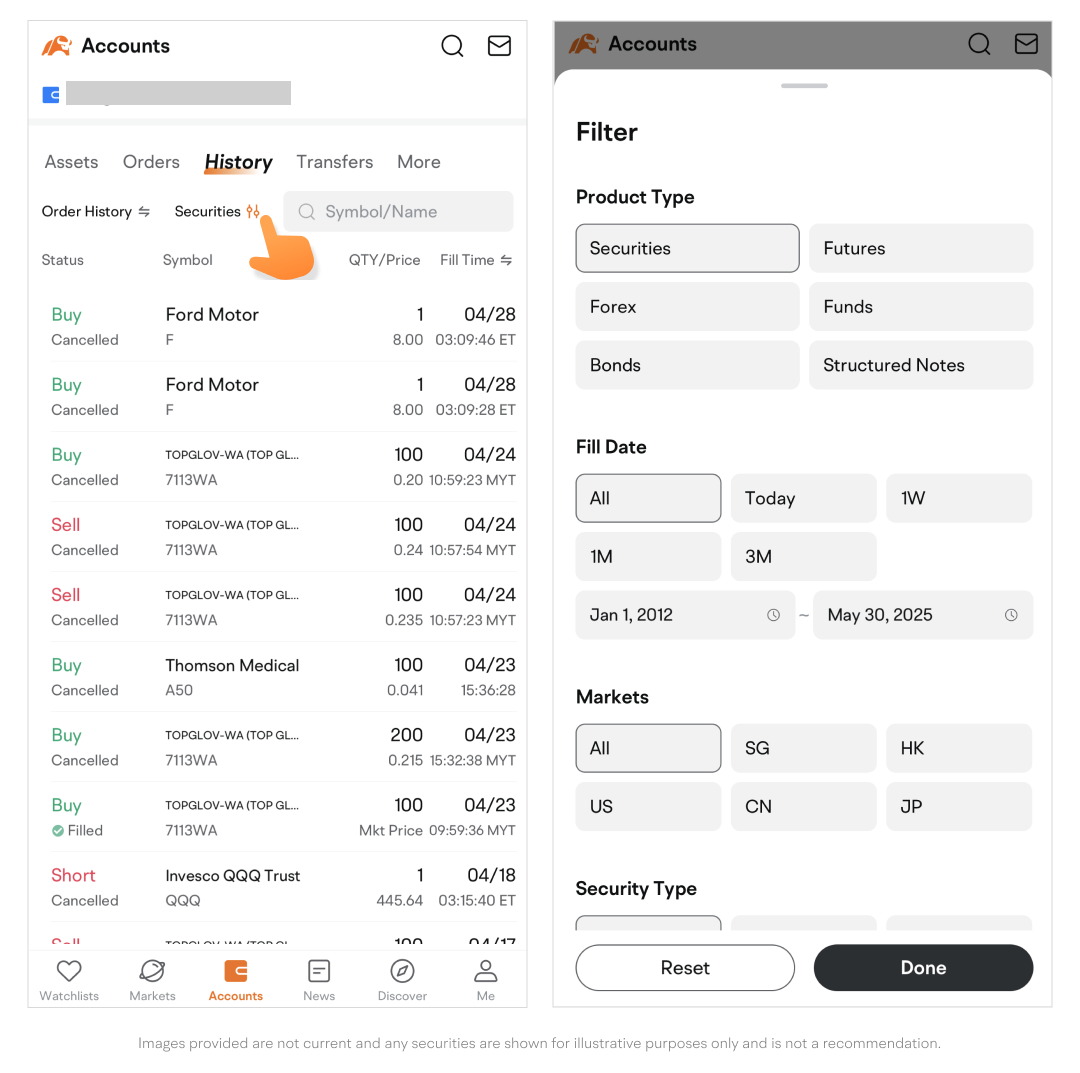• Tap Filter next to Order History to filter orders by product type, time range, market, trading action, order status, or order type.