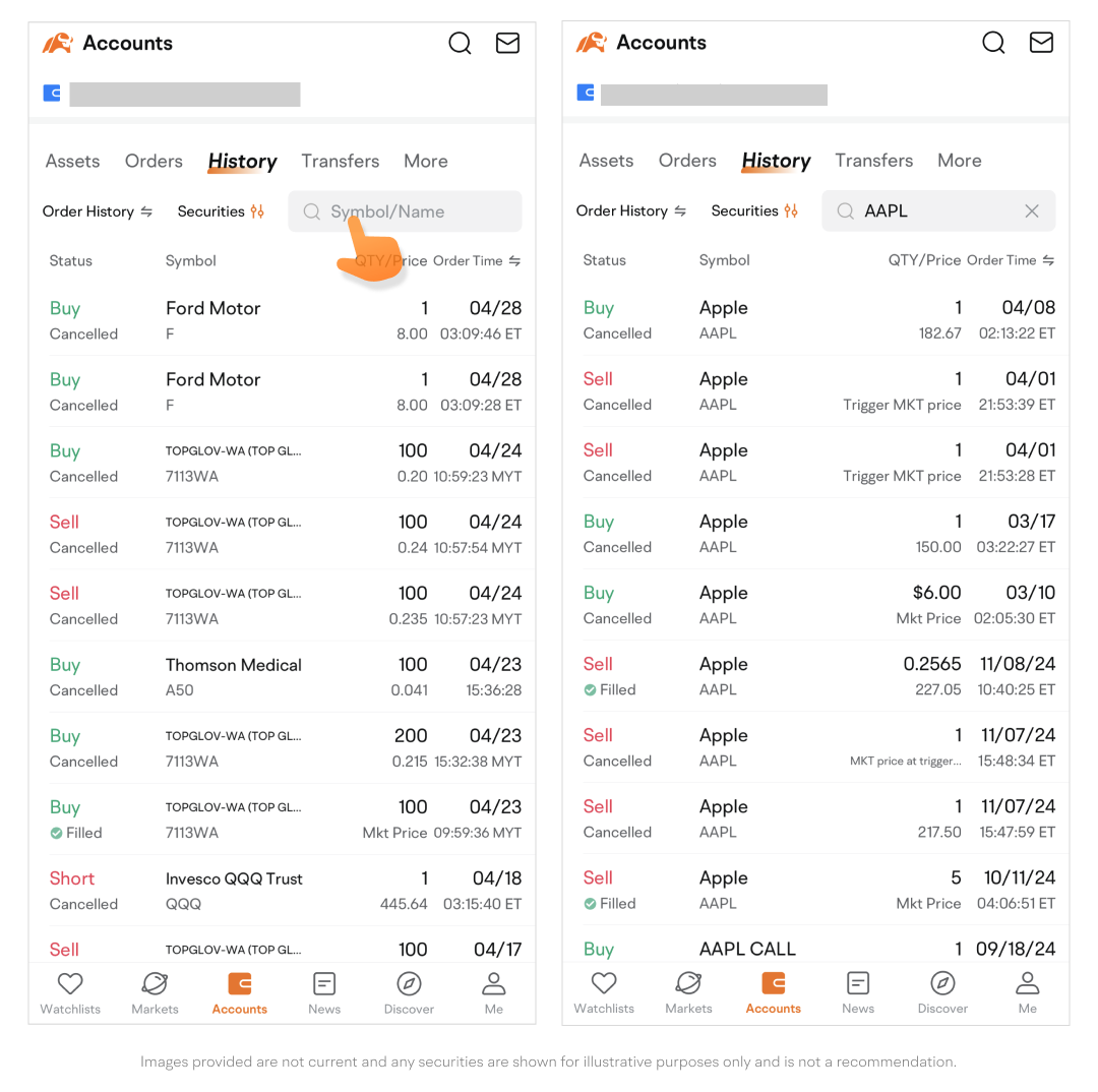 • Enter a symbol or name in the search box to find related orders.