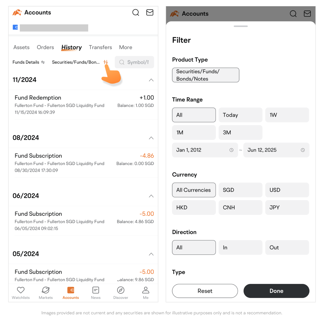 • Tap Filter next to Funds Details to filter funds entries by time range, currency, direction, and product type.