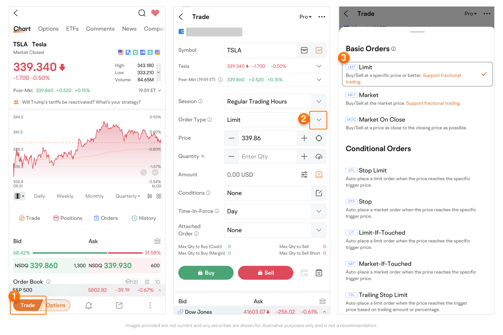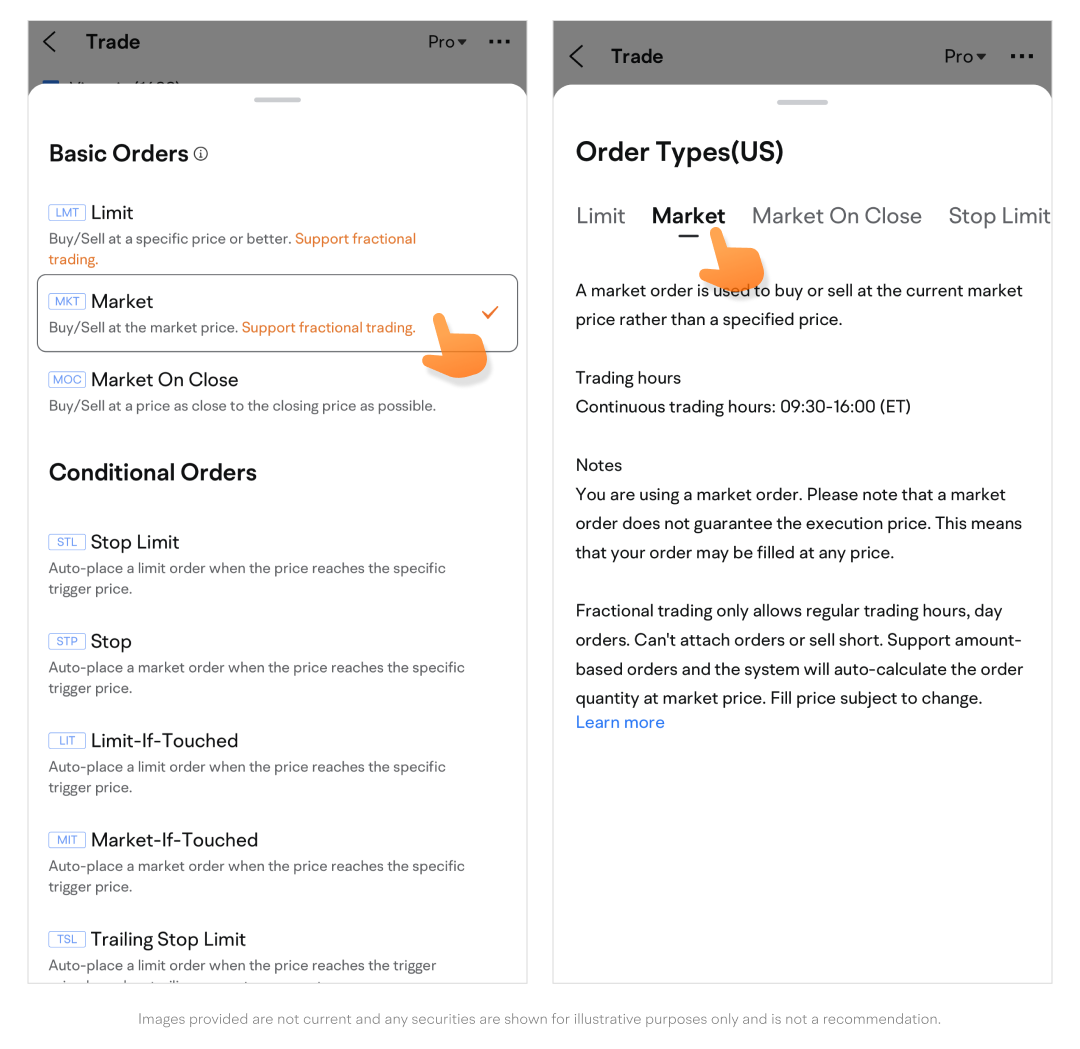Tap the i icon right next to "Order Type" to access the tips for each order type, including their definitions, applicable trading hours, and detailed usage guidelines.