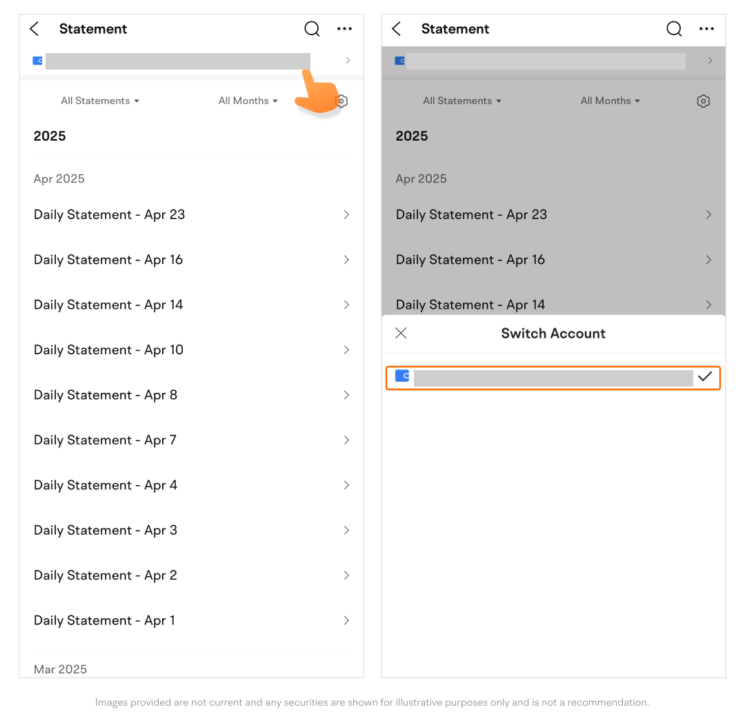 To view statements from a different account, tap the > icon in the upper right corner, and a list of accounts will pop up.