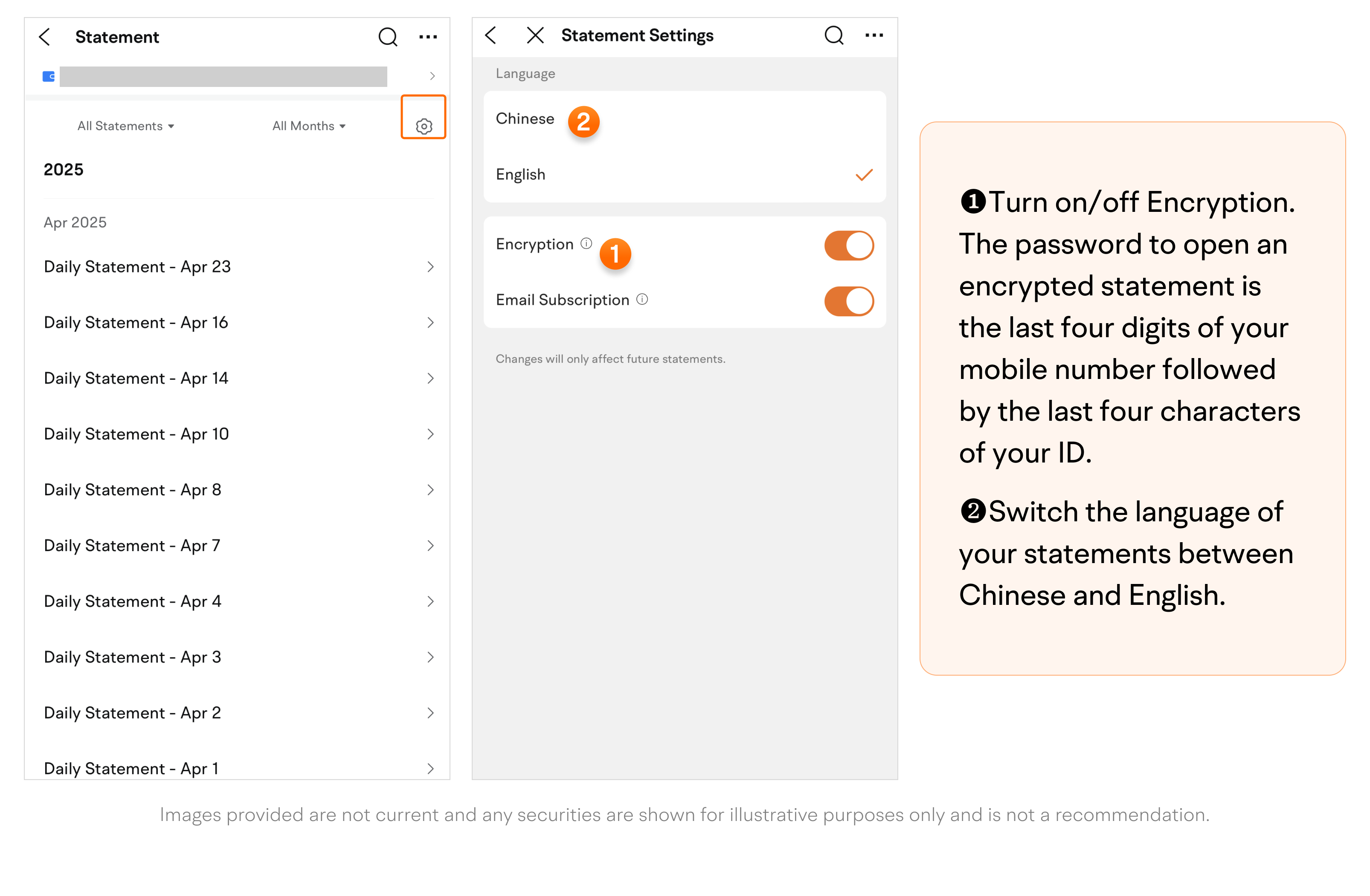 • Apart from encryption settings, you can also switch the language of your statements between Chinese and English.