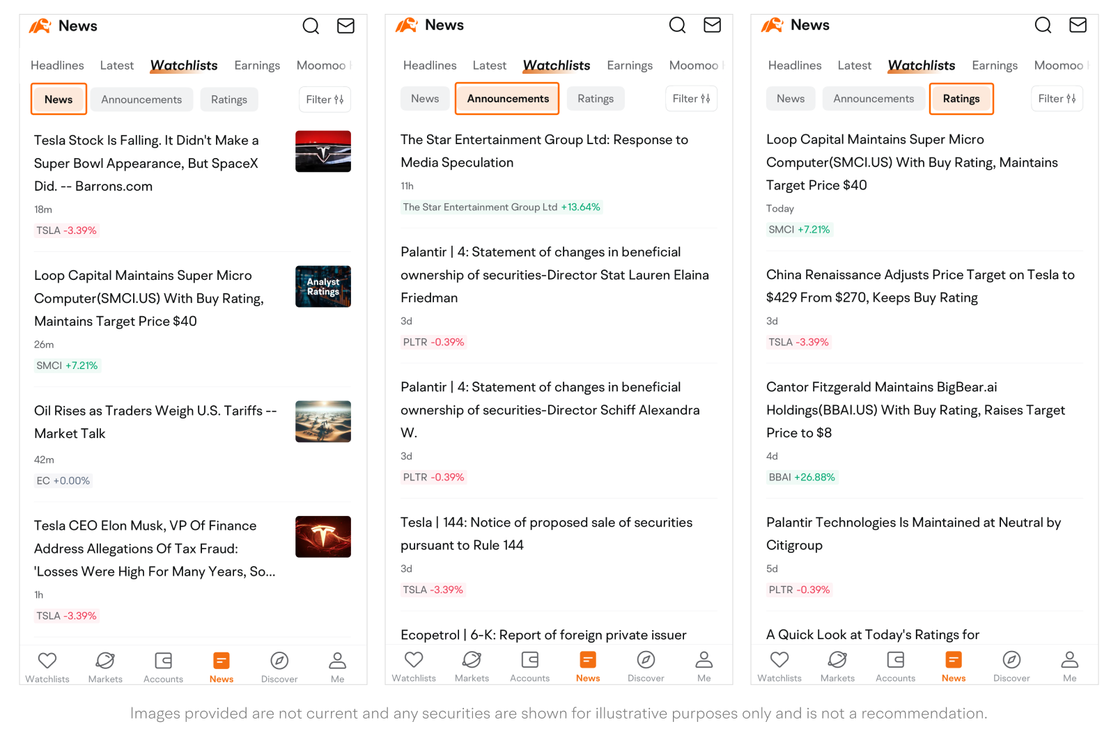 • Tap News, Announcements, or Ratings at the top to quickly switch between types.