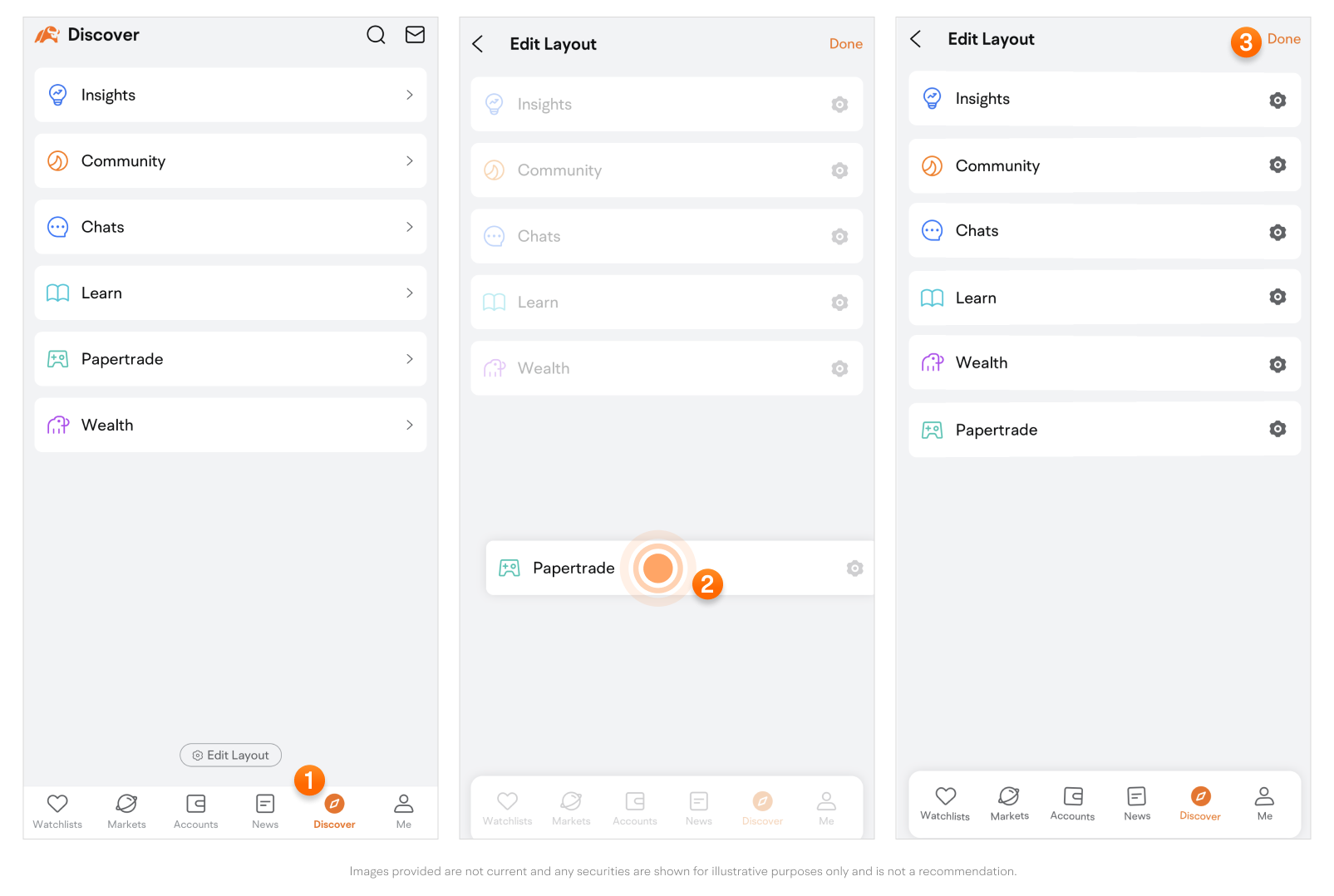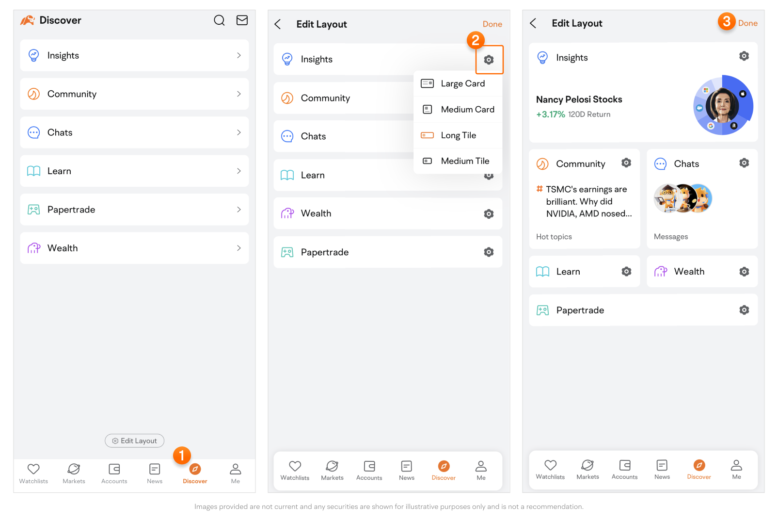 Easily navigate moomoo with a fully customizable Dock. Go to Discover, then tap Edit Layout to get started.