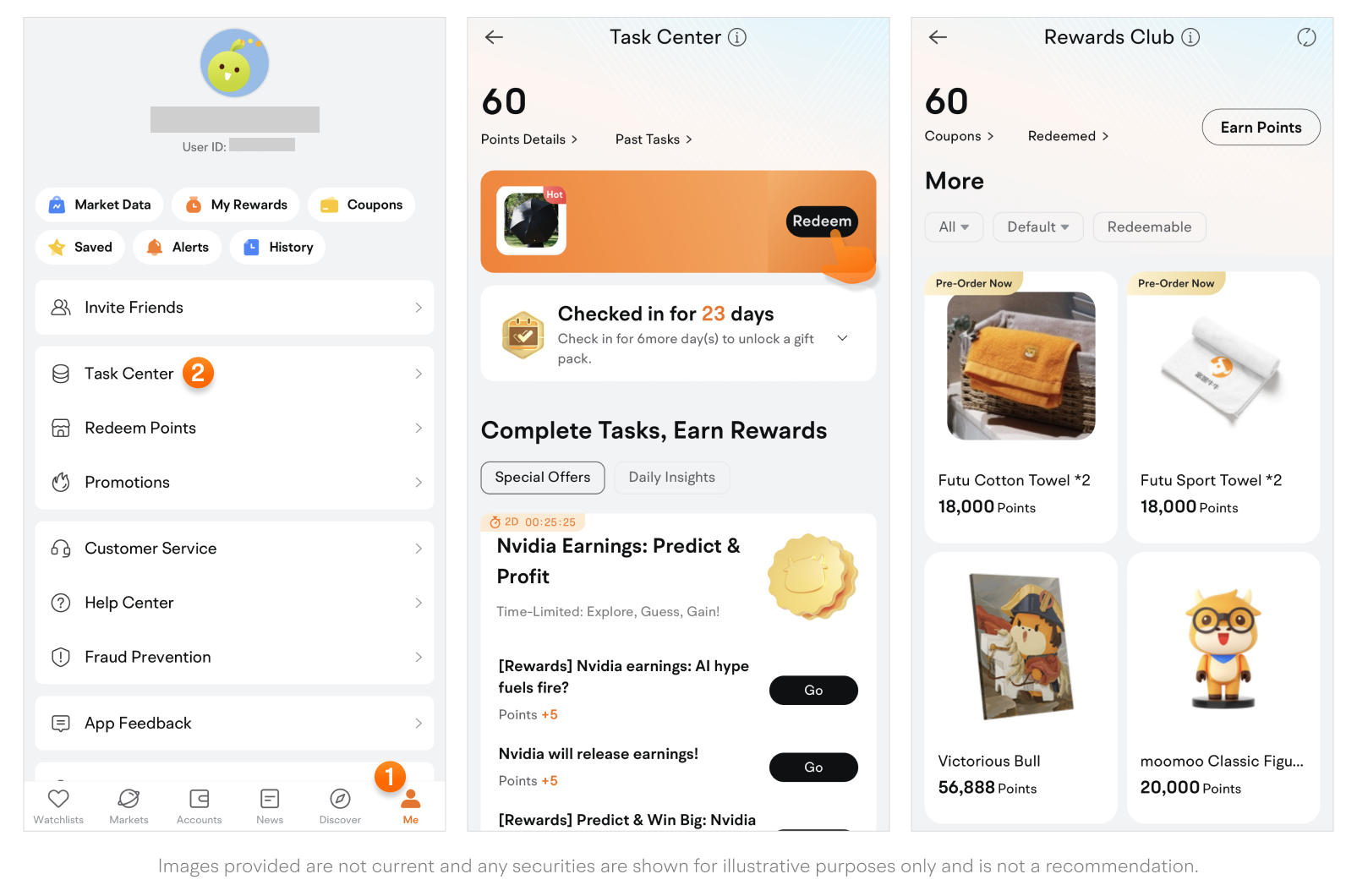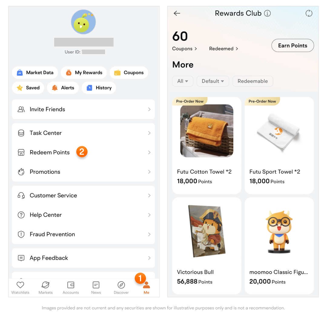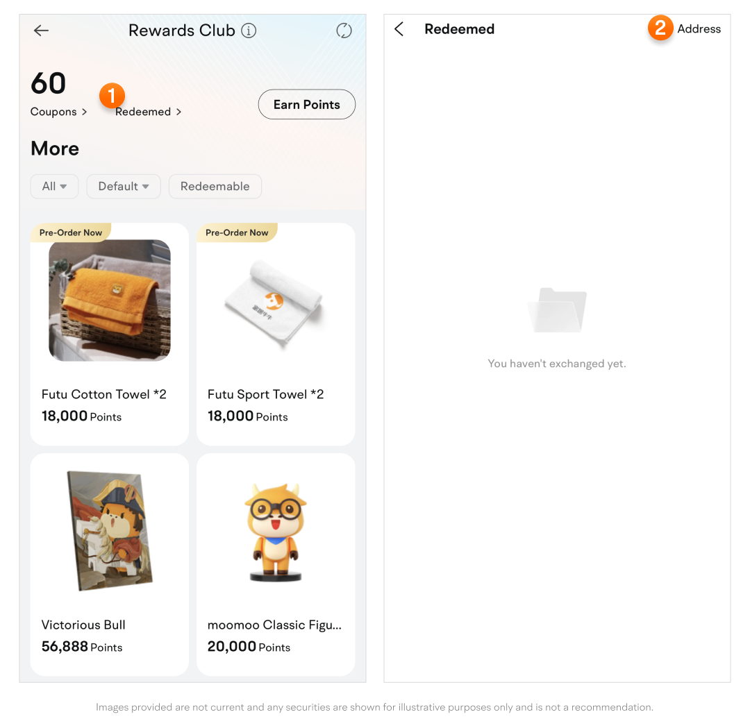 Redeem points for moomoo merchandise, artwork, and trading coupons in Rewards Club.