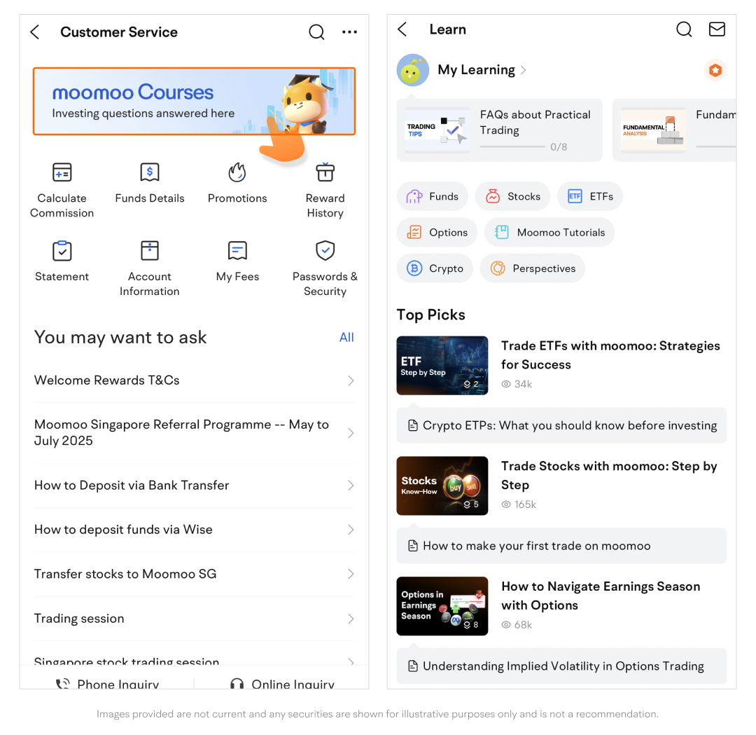 • Tap the Moomoo Course banner at the top to learn investing knowledge.