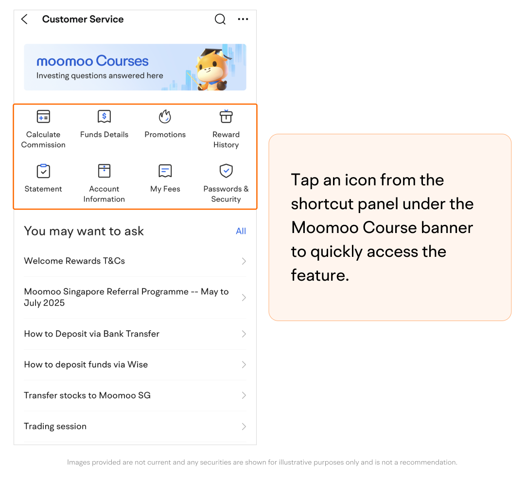 • Tap an icon from the shortcut panel under the Moomoo Course banner to quickly access the feature.
